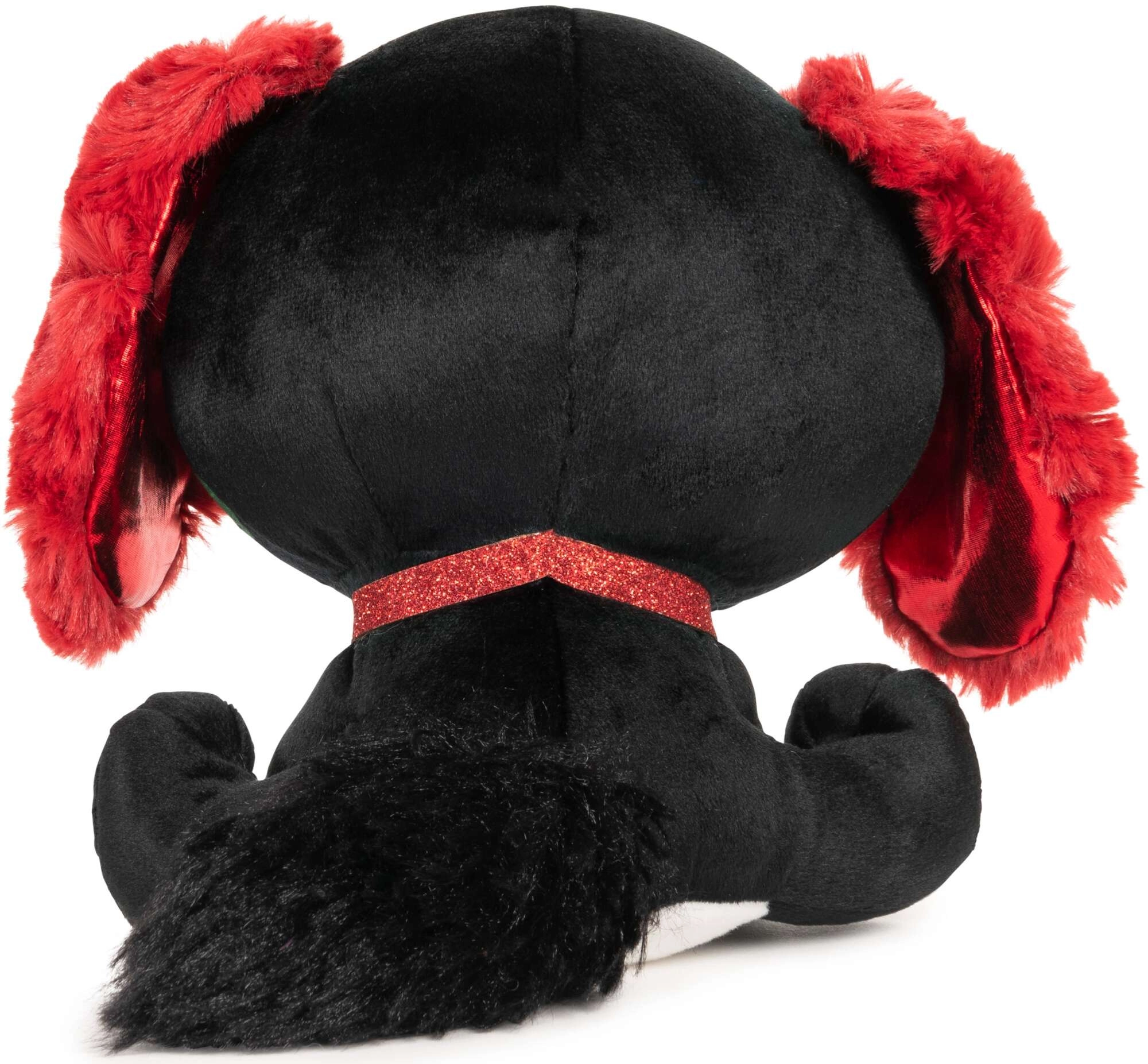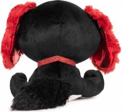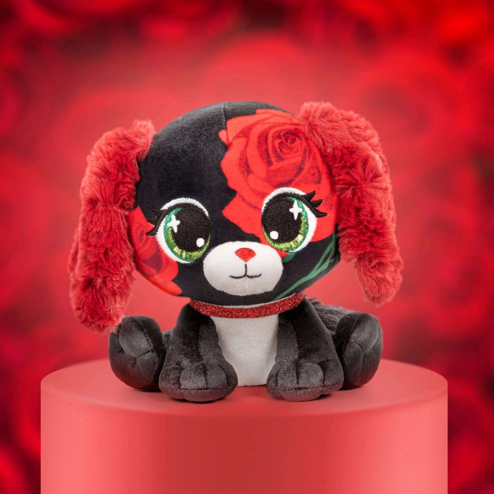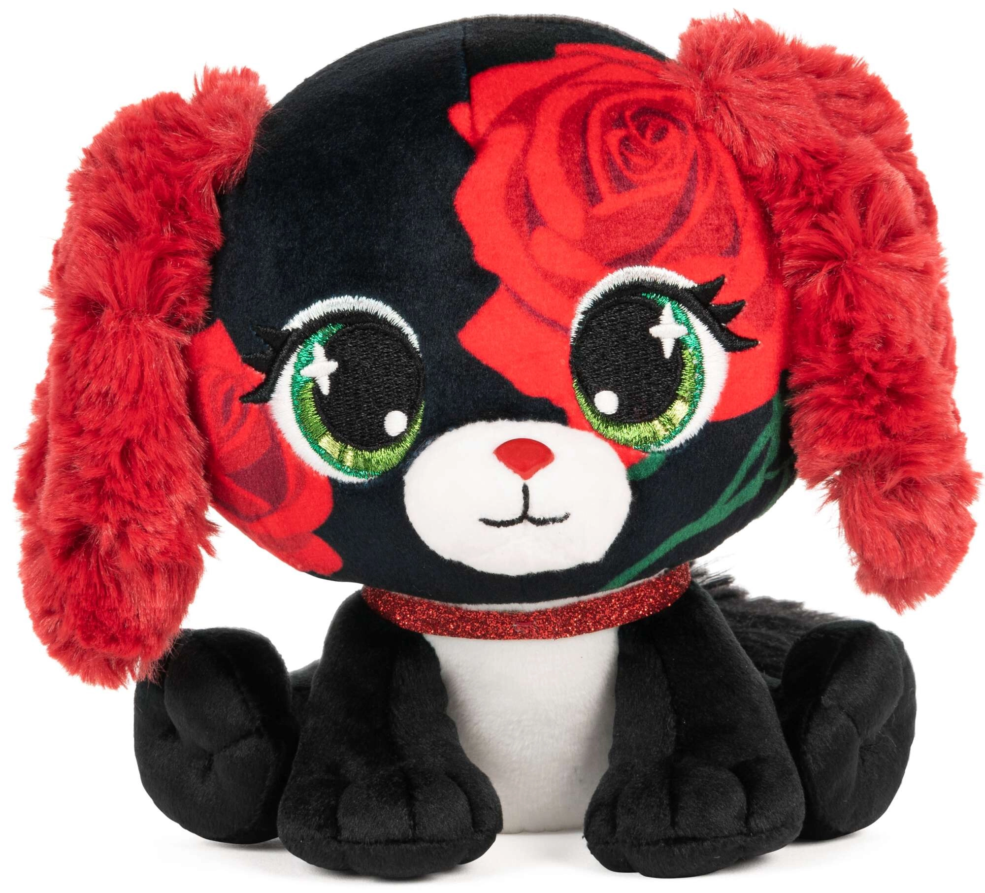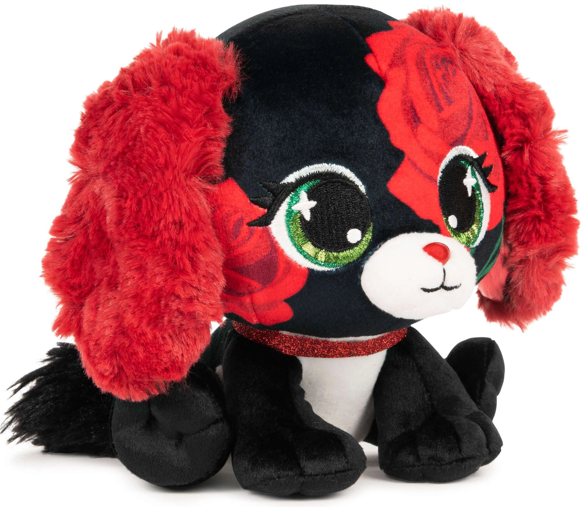 Wir präsentieren den stylischen Kuschelfreund aus der Reihe P.Lushes Pets – den Hund Anna Dolce. Auf den ersten Blick beeindruckt er mit kontrastierendem schwarzem Fell mit roten Rosen, weichen roten Ohren und einer niedlichen Schnauze. Das glitzernde Halsband verleiht dem Spielzeug eleganten Charme und macht es zu einem tollen Geschenk für kleine und größere Plüschliebhaber.