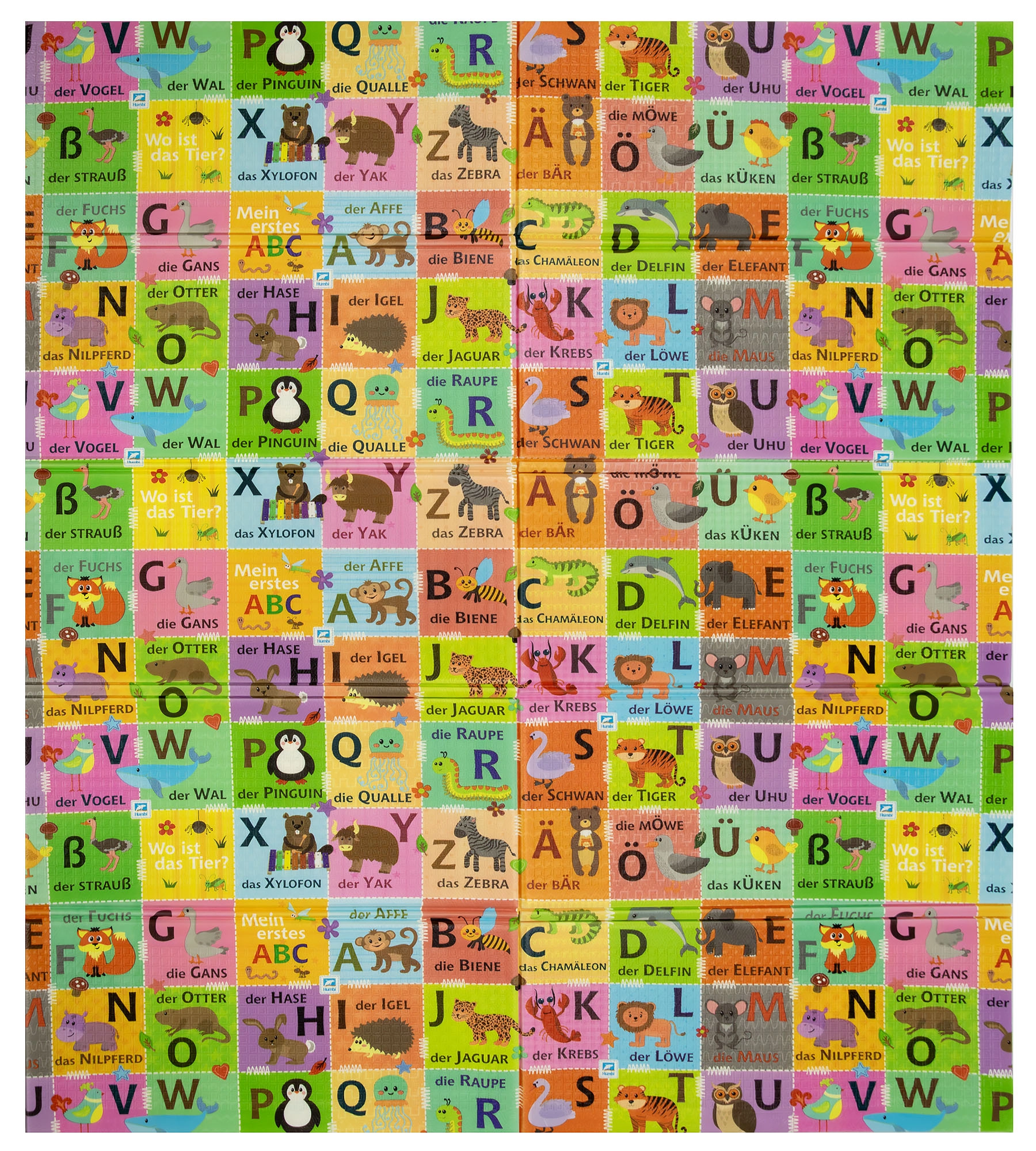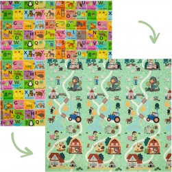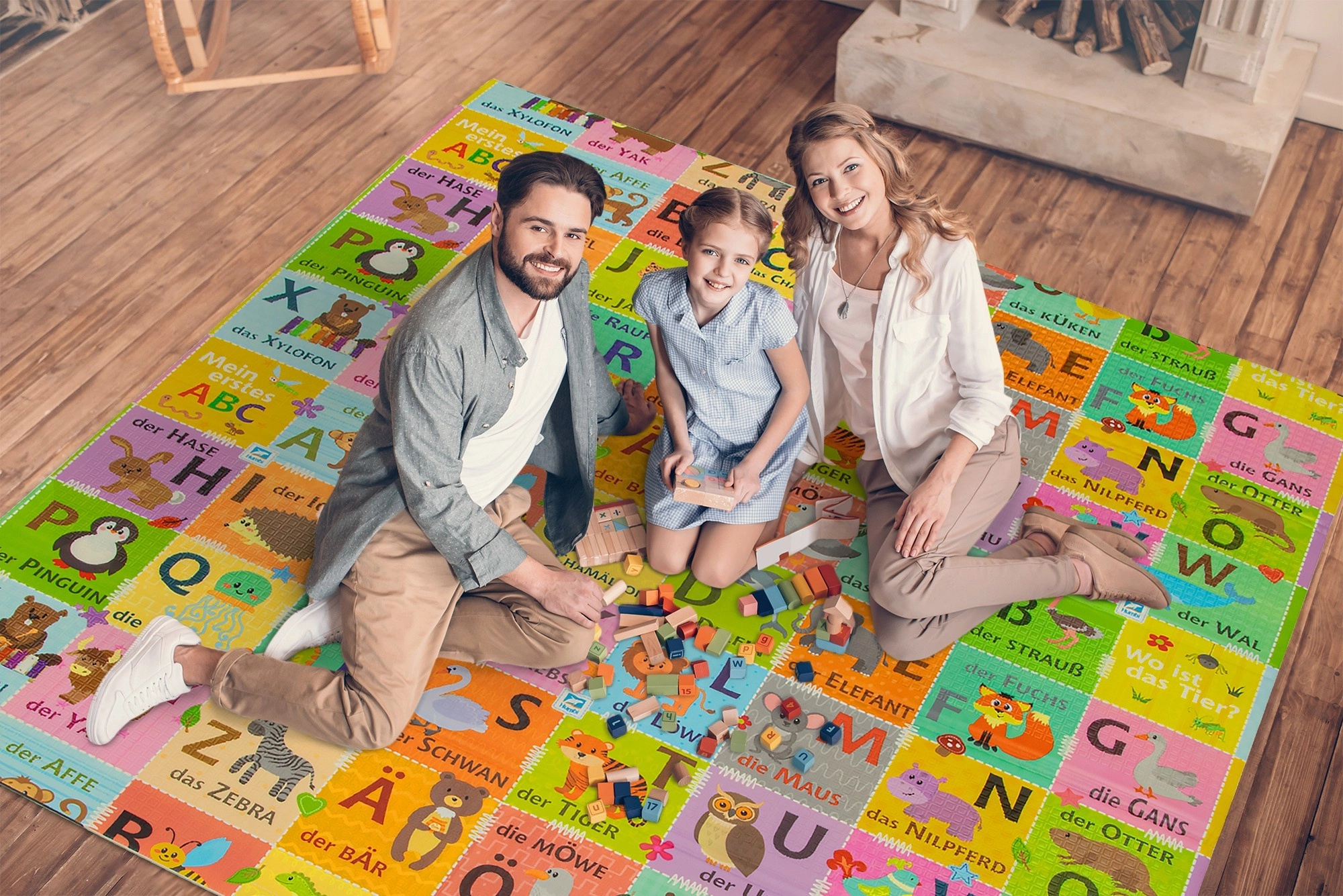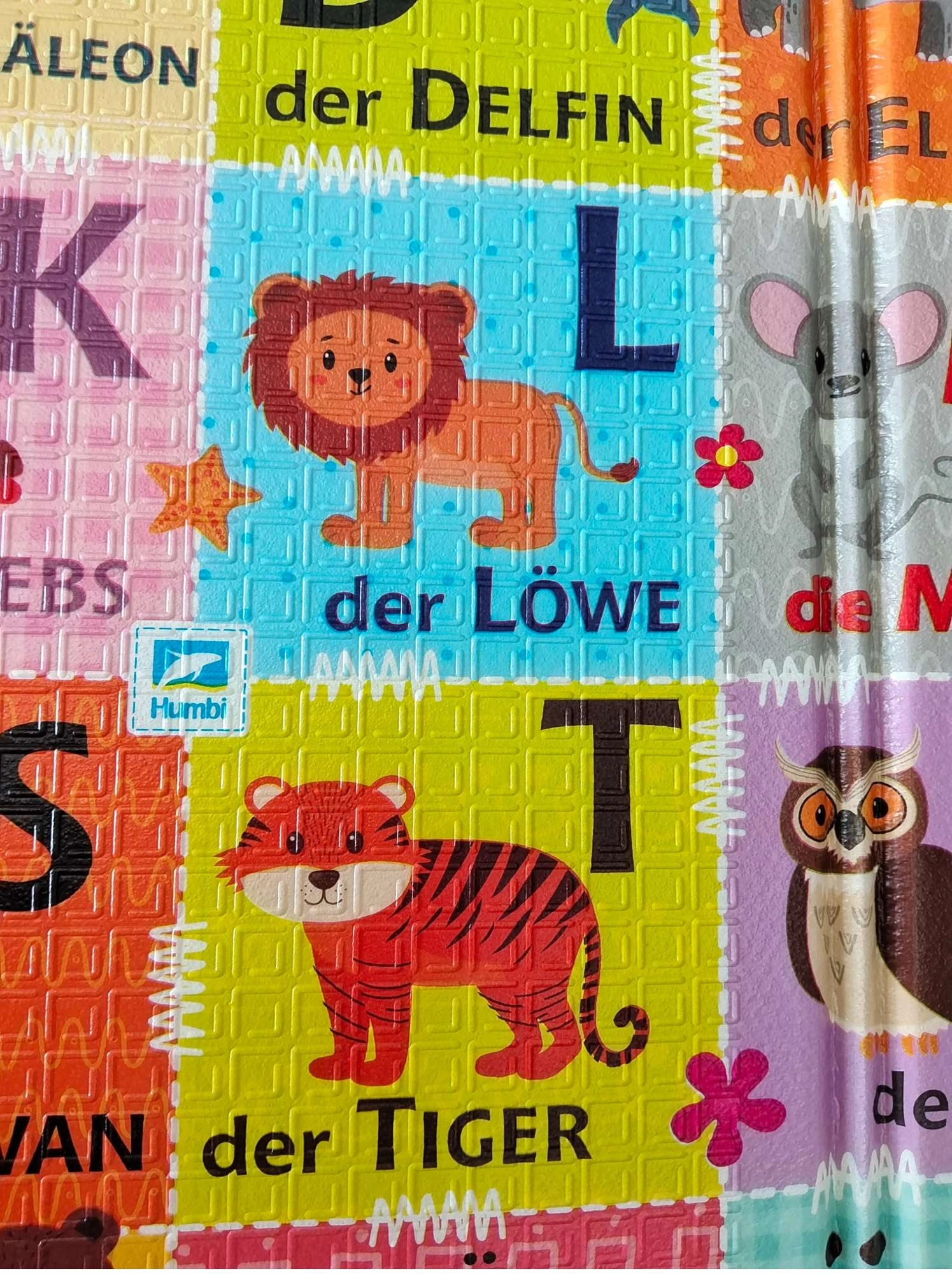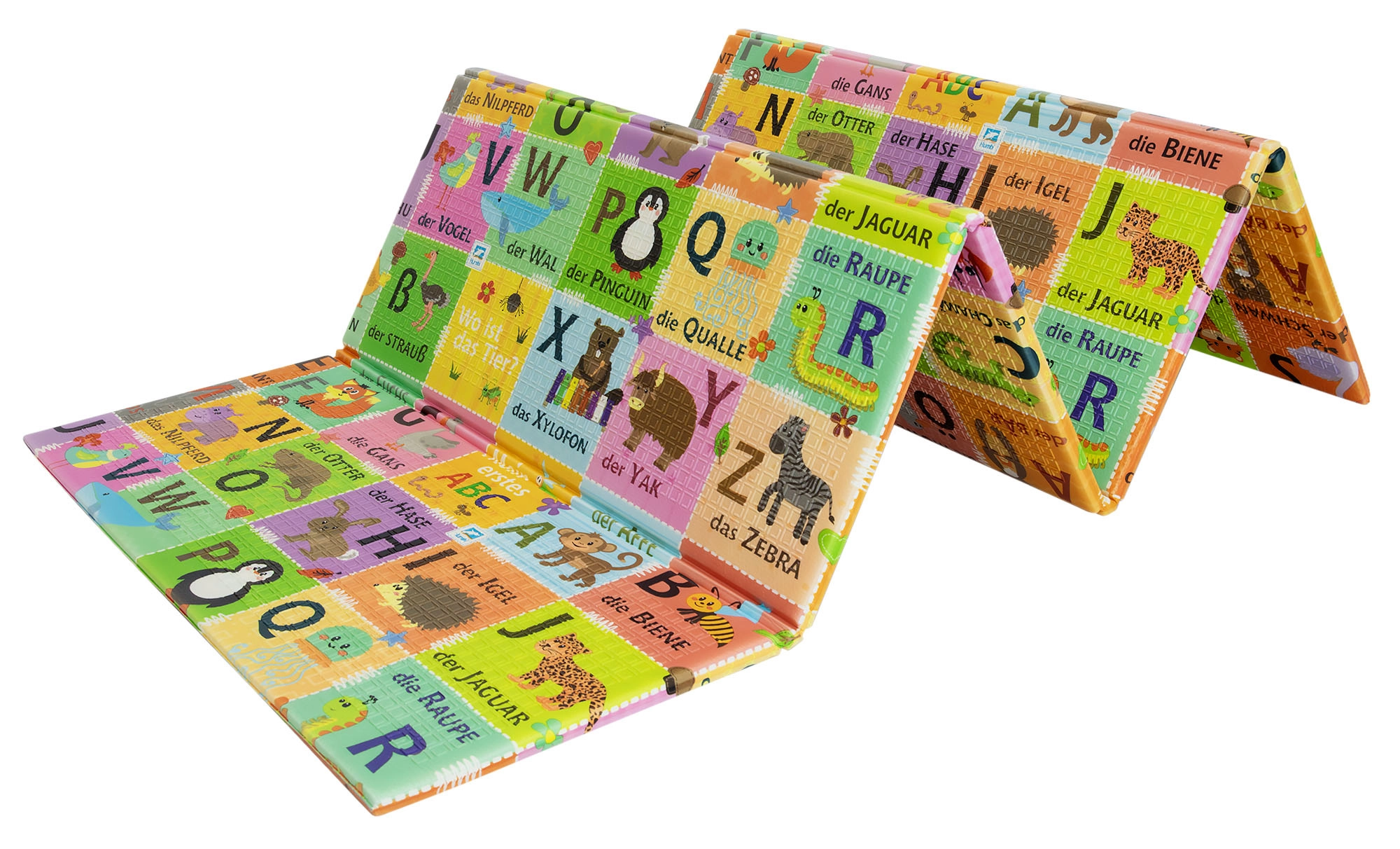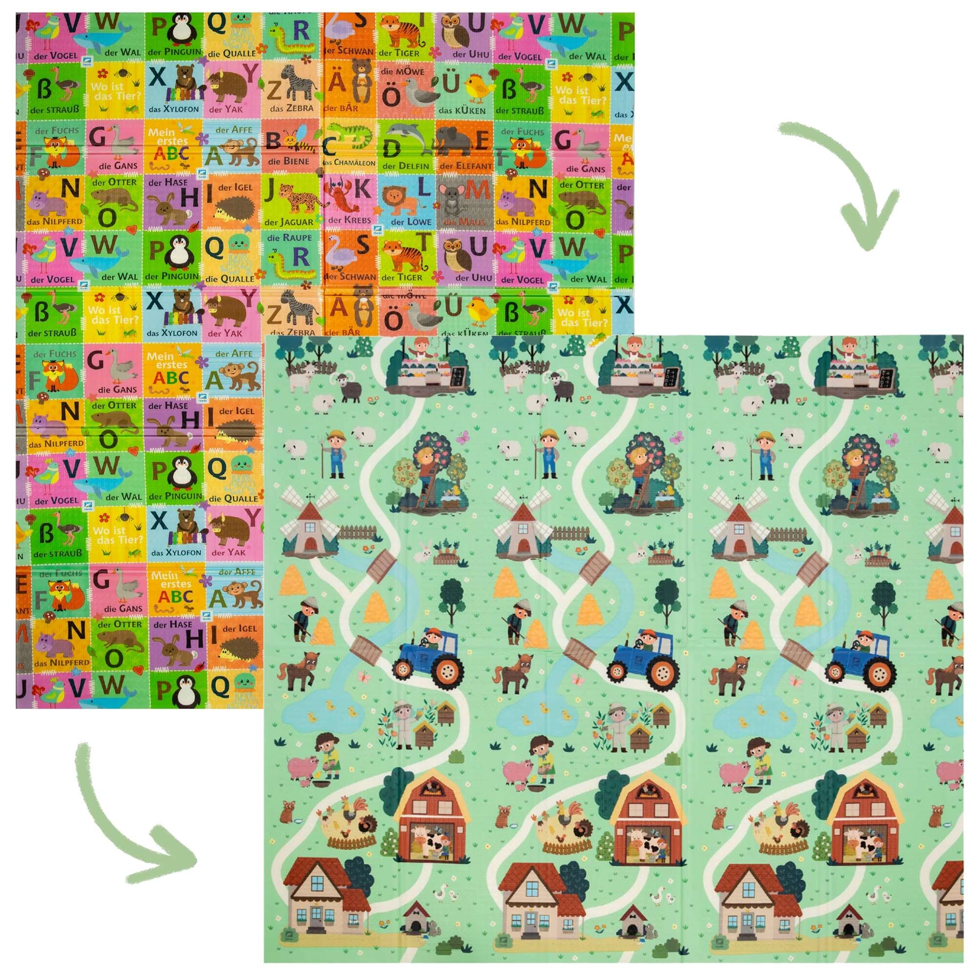 Zwei Seiten mit edukativen Grafiken fördern frühes Lernen: eine zeigt das deutsche Alphabet mit Tieren, die andere eine Szene aus dem Landleben. Dank der rutschfesten, fein strukturierten Oberfläche ist sie sicher zum Krabbeln und Laufen und fördert die sensorische Entwicklung.