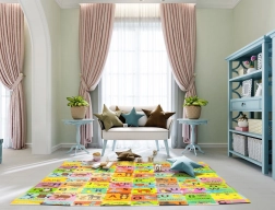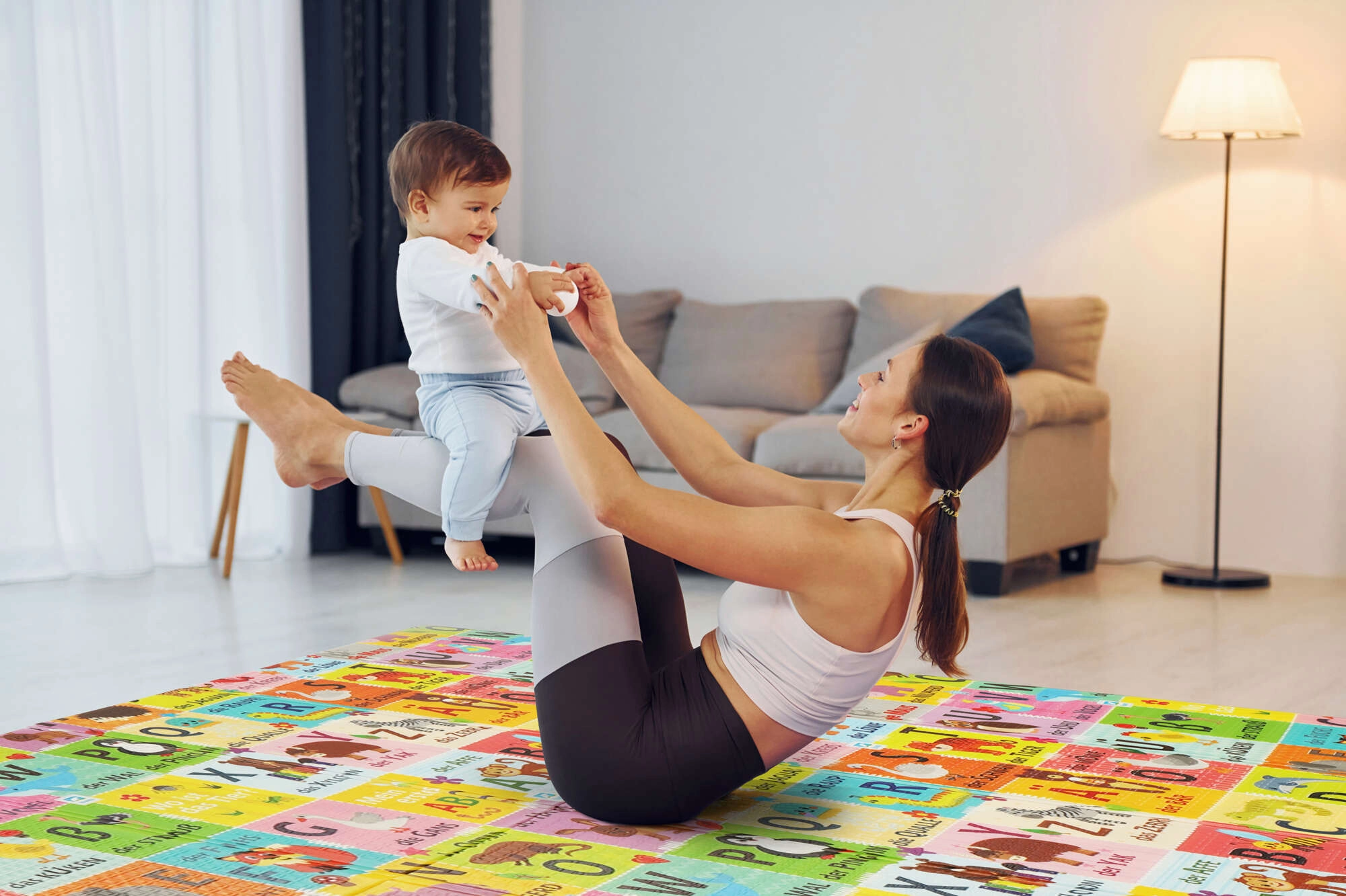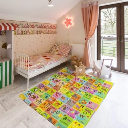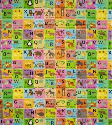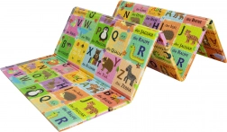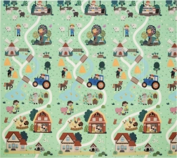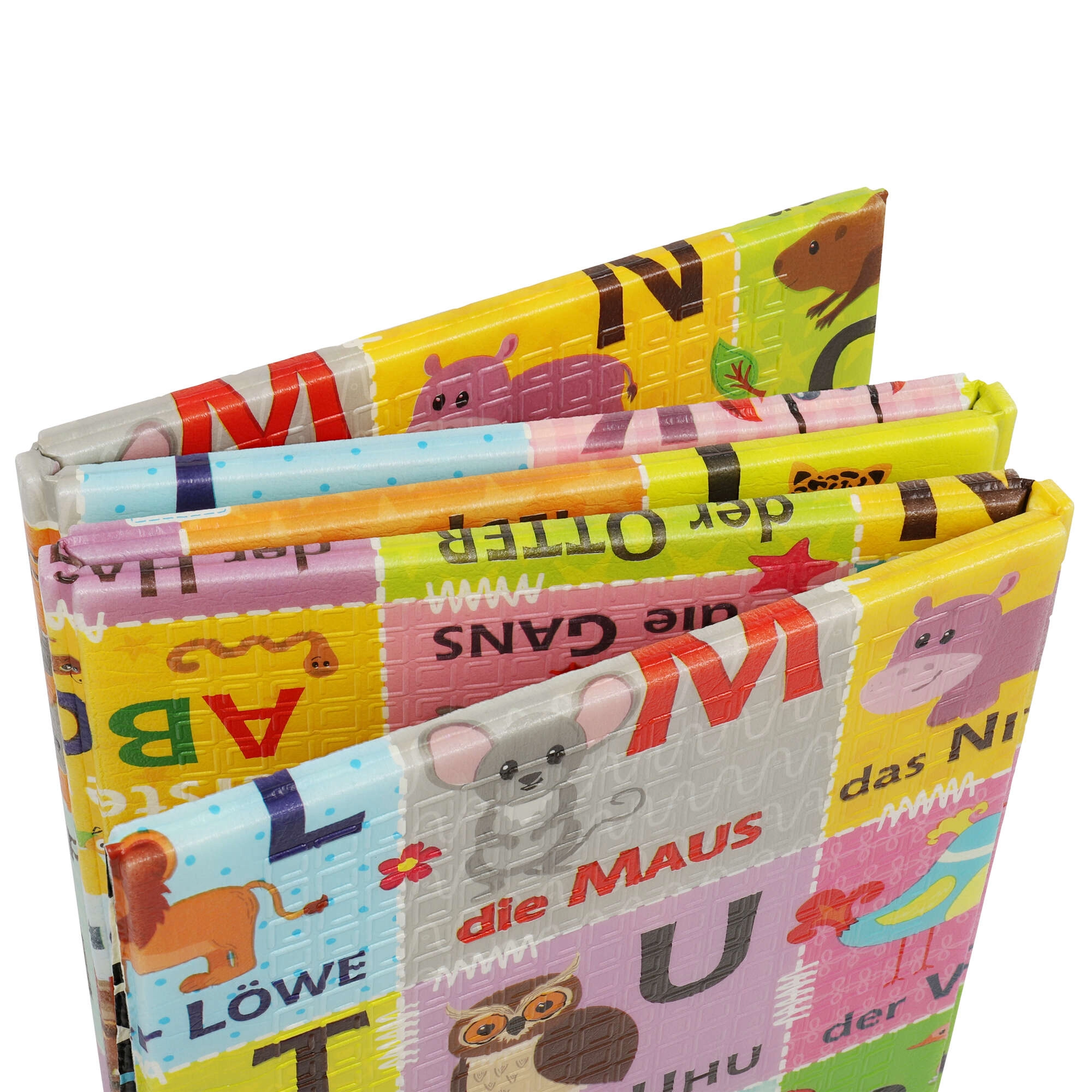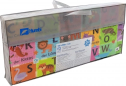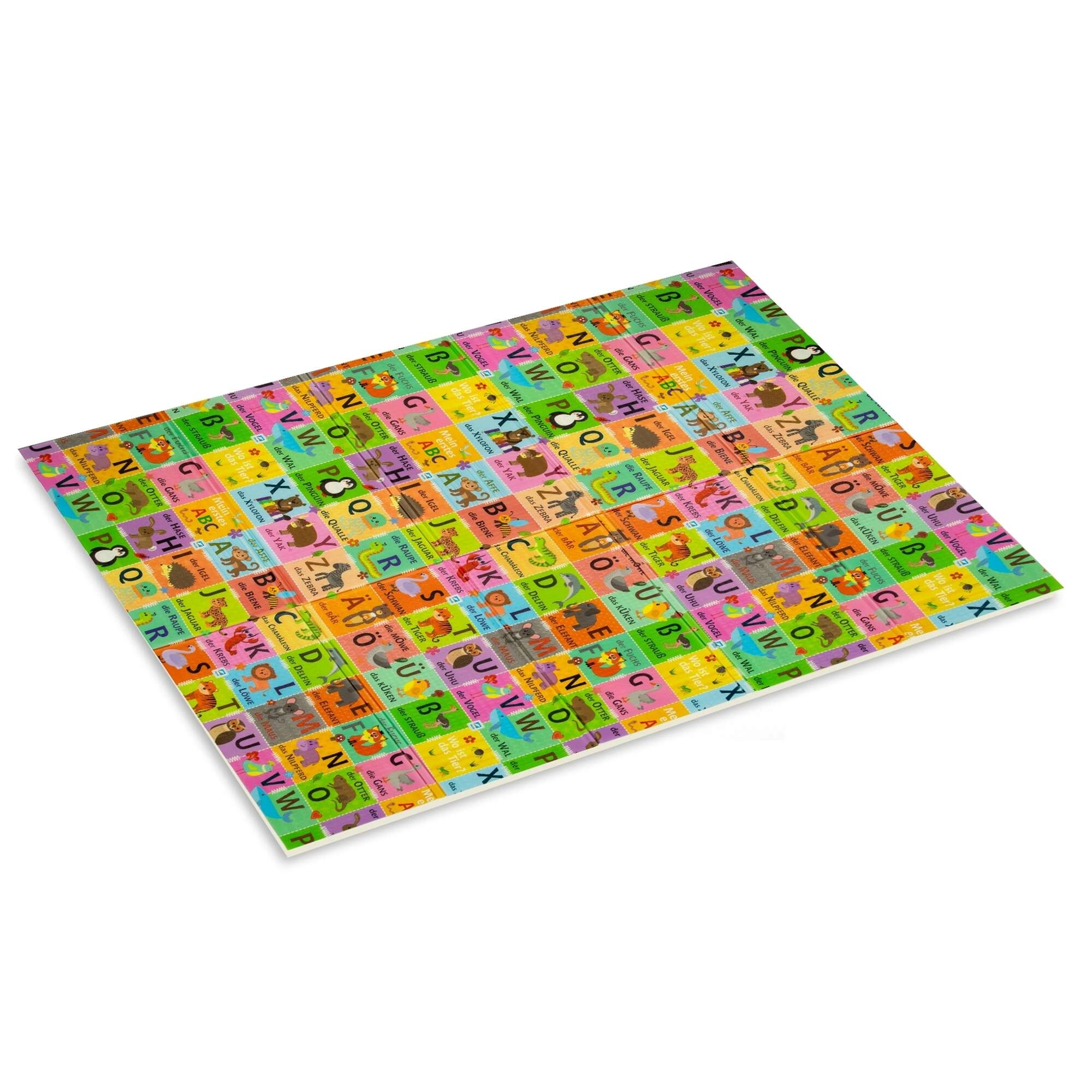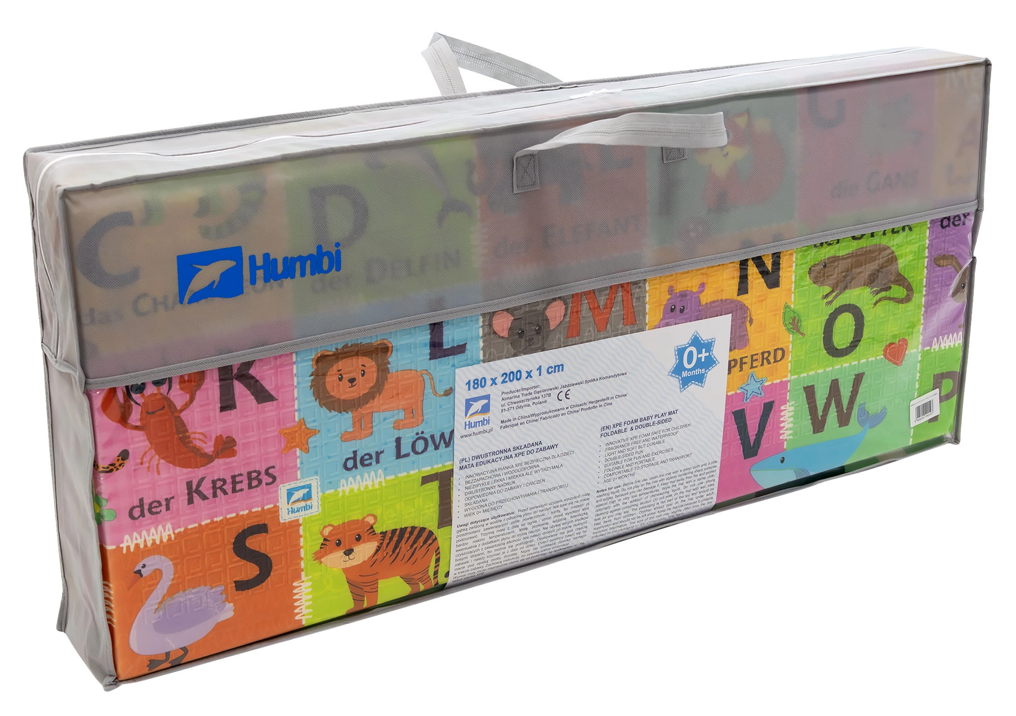 Zwei Seiten mit edukativen Grafiken fördern frühes Lernen: eine zeigt das deutsche Alphabet mit Tieren, die andere eine Szene aus dem Landleben. Dank der rutschfesten, fein strukturierten Oberfläche ist sie sicher zum Krabbeln und Laufen und fördert die sensorische Entwicklung.