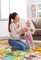 Die strukturierte Oberfläche sorgt für Stabilität beim Krabbeln und Gehen. Die Matte lässt sich schnell zusammenfalten, in die Tasche legen und mit einem feuchten Tuch leicht reinigen.