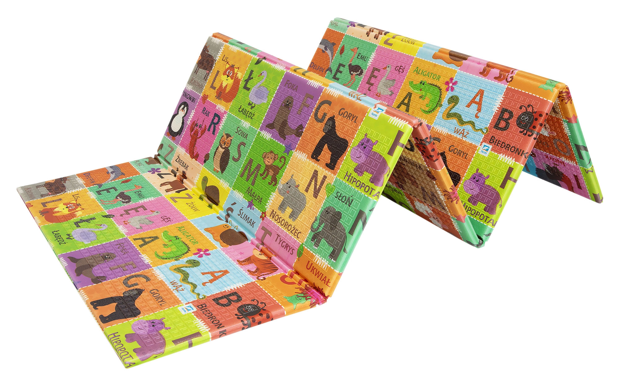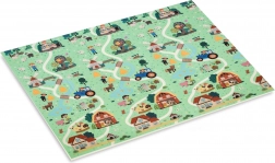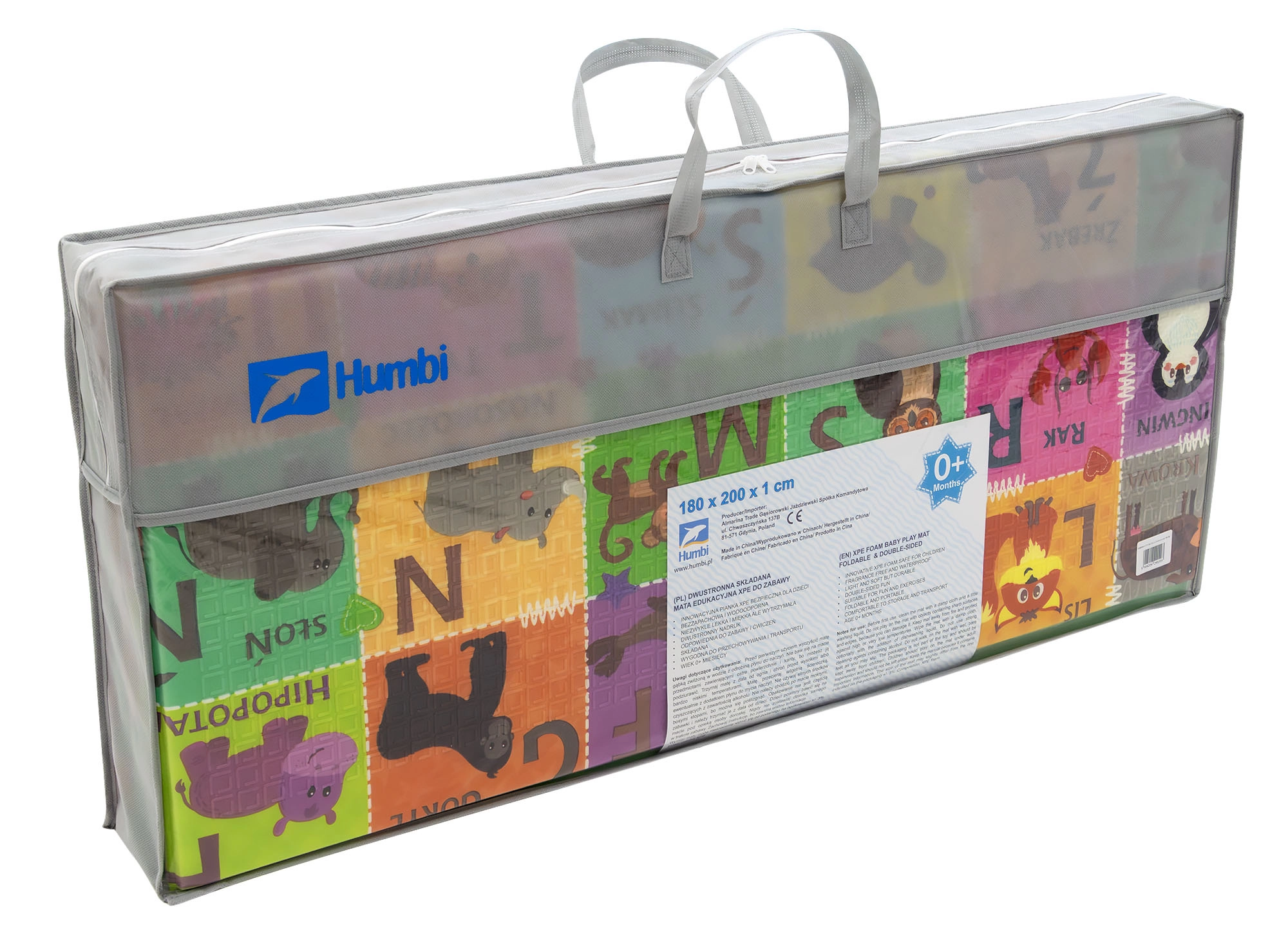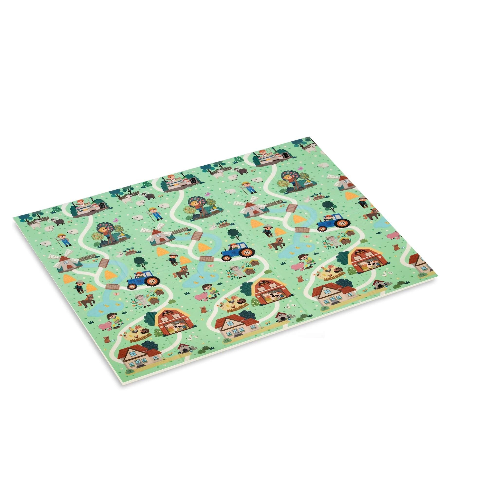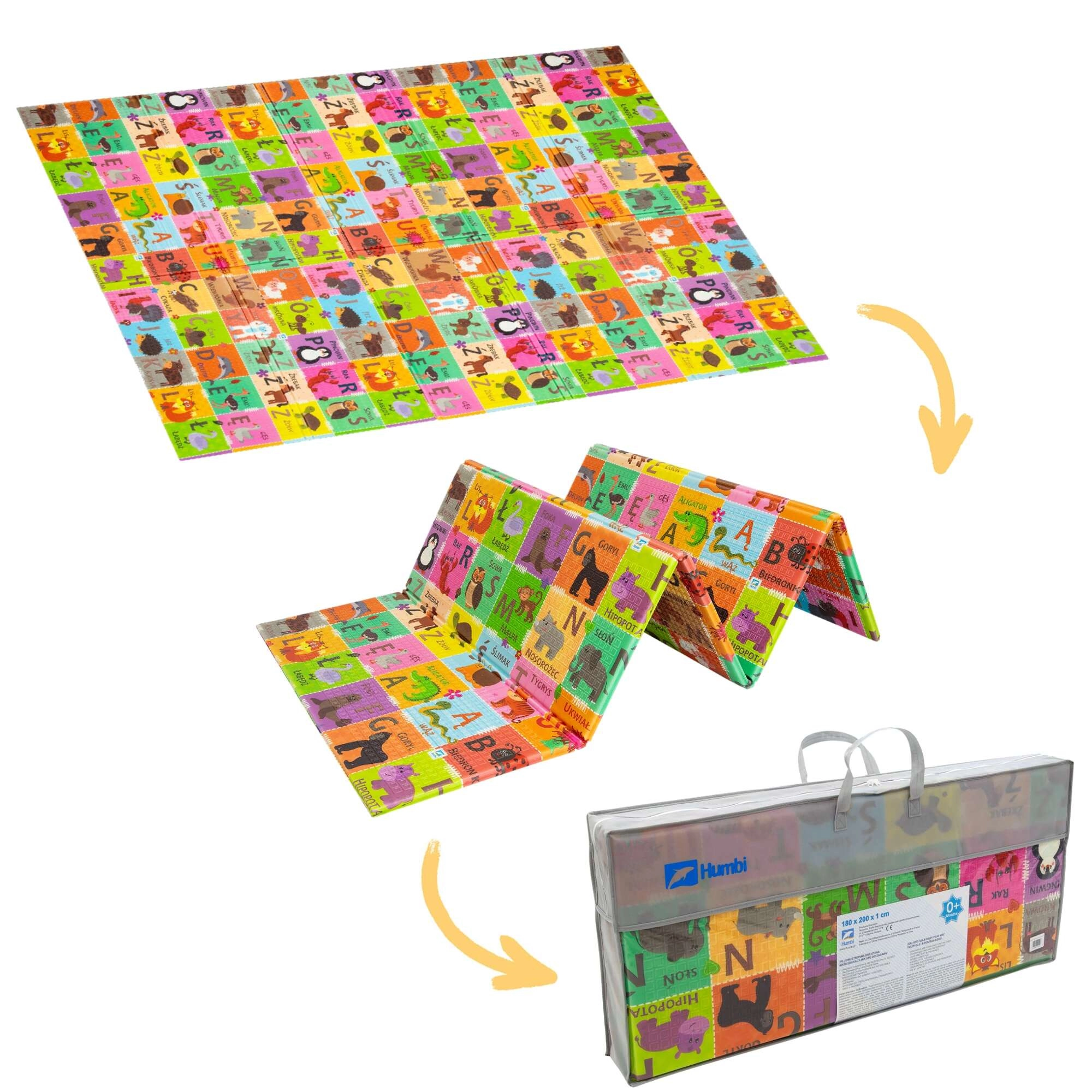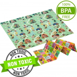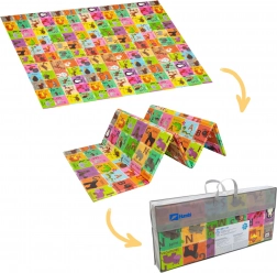 Zwei verspielte Seiten fördern die Entwicklung des Kindes: ein buntes Alphabet mit Tieren und ein Dorfszenario mit Straßen zum Fahren mit Spielautos und Entdecken. Die Matte lässt sich in wenigen Sekunden zusammenfalten, in der mitgelieferten Tasche transportieren und dank der wasserabweisenden Oberfläche einfach mit einem feuchten Tuch abwischen.