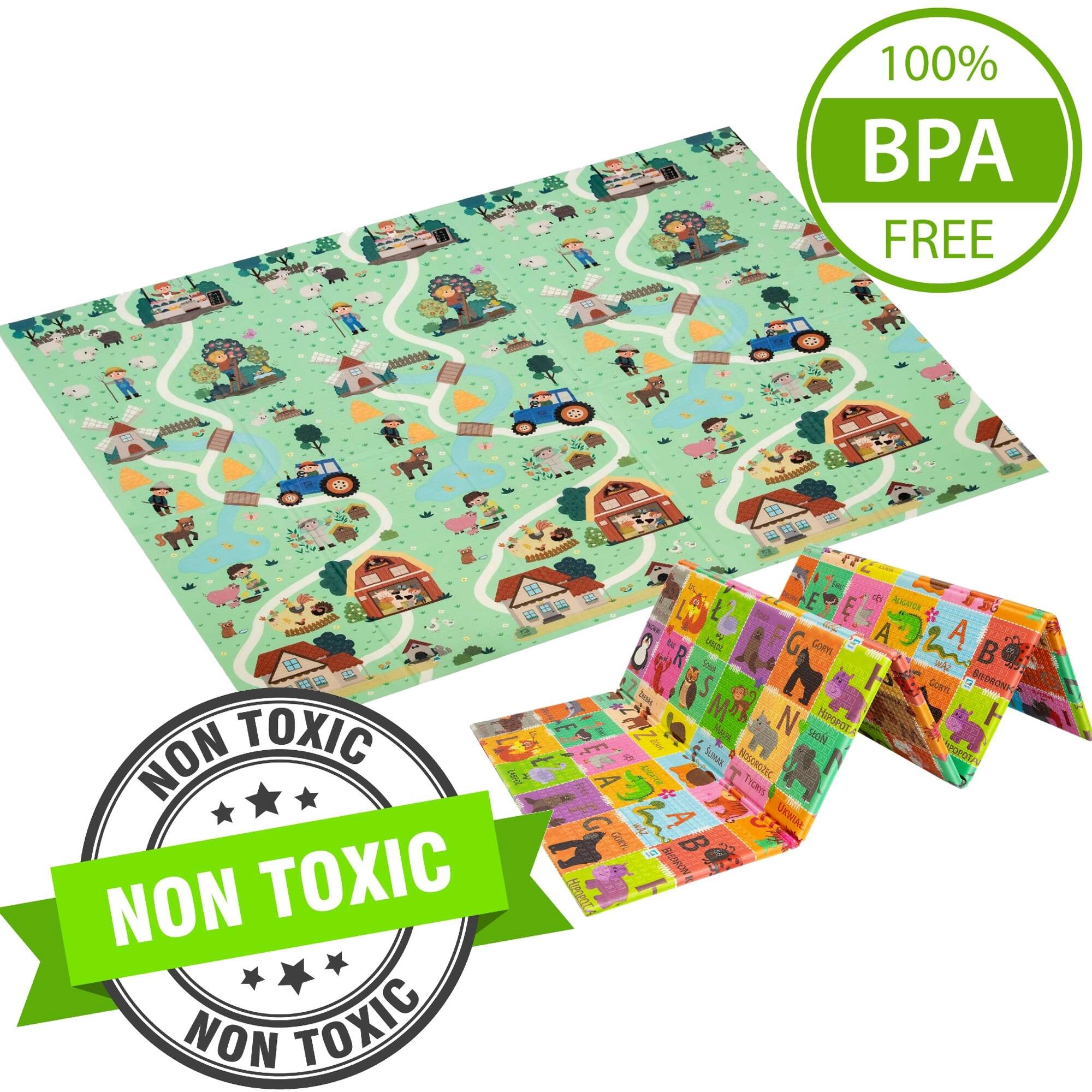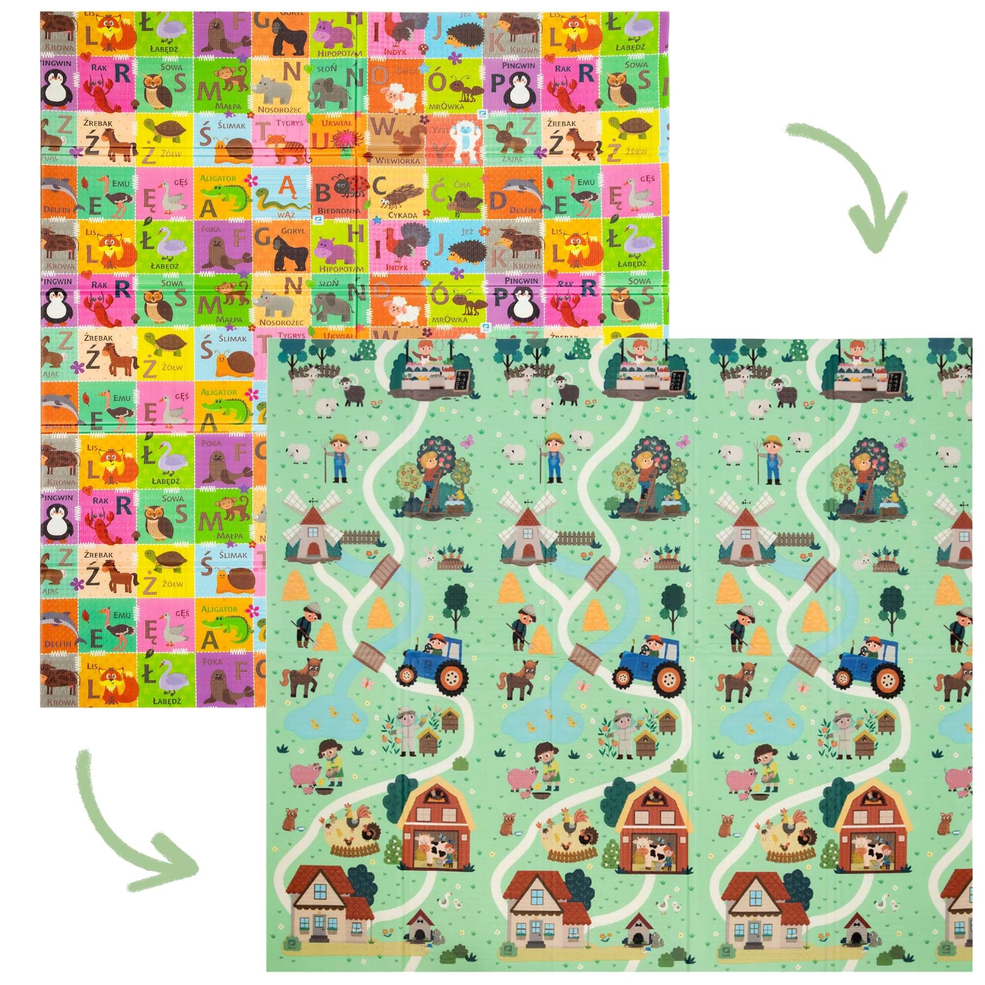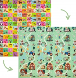 Eine Seite mit buntem Alphabet und Tieren unterstützt den Wortschatz, die andere Seite mit Bauernhof- und Straßenmotiv ist ideal für das Spiel mit Autos und die Fantasie.