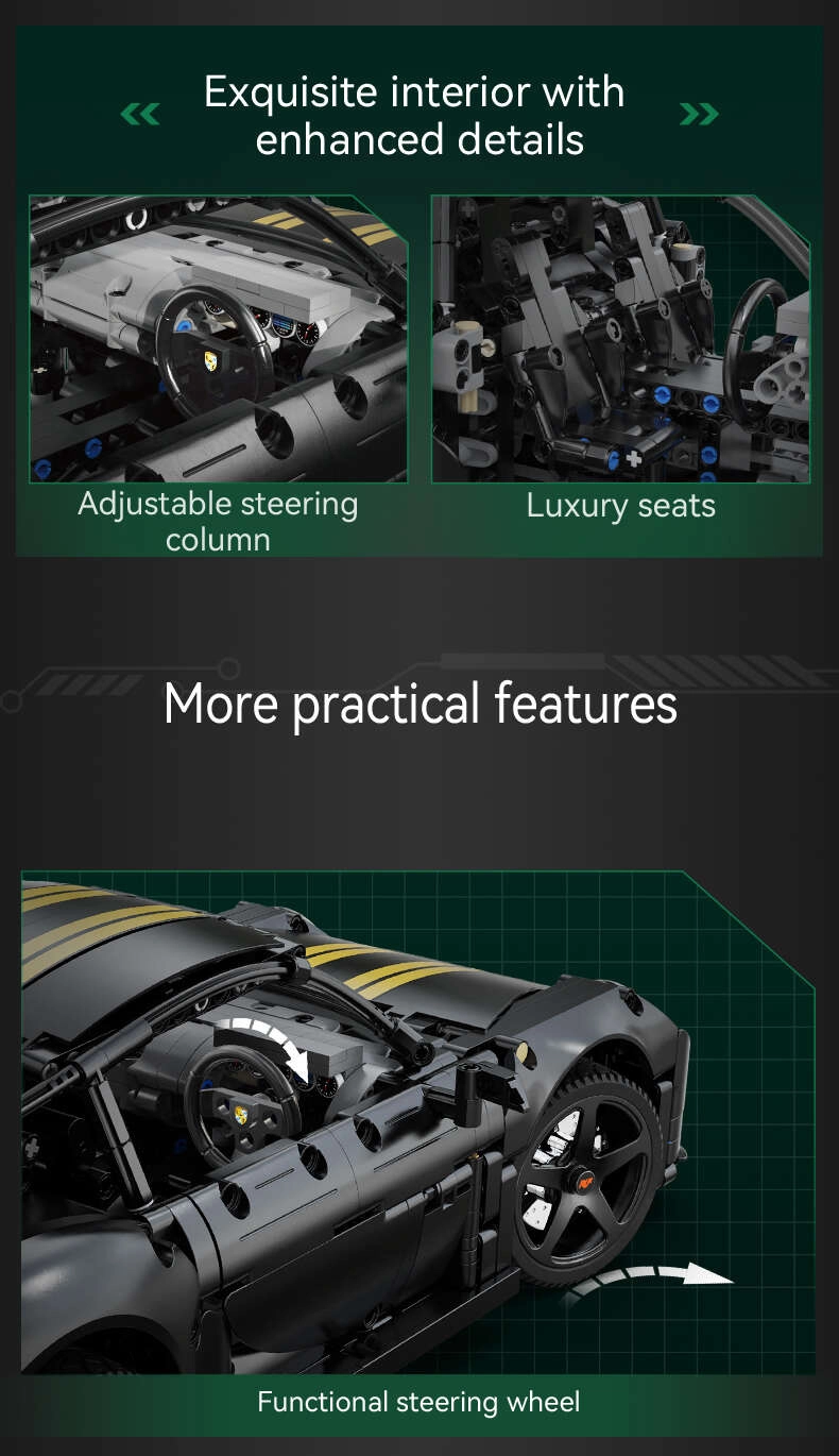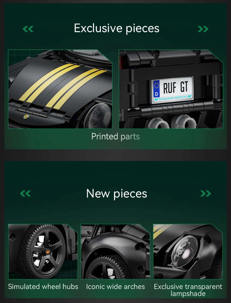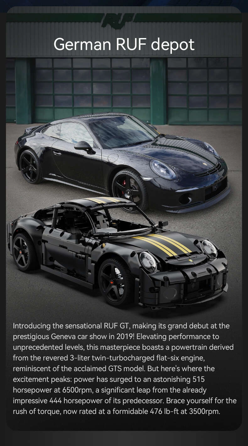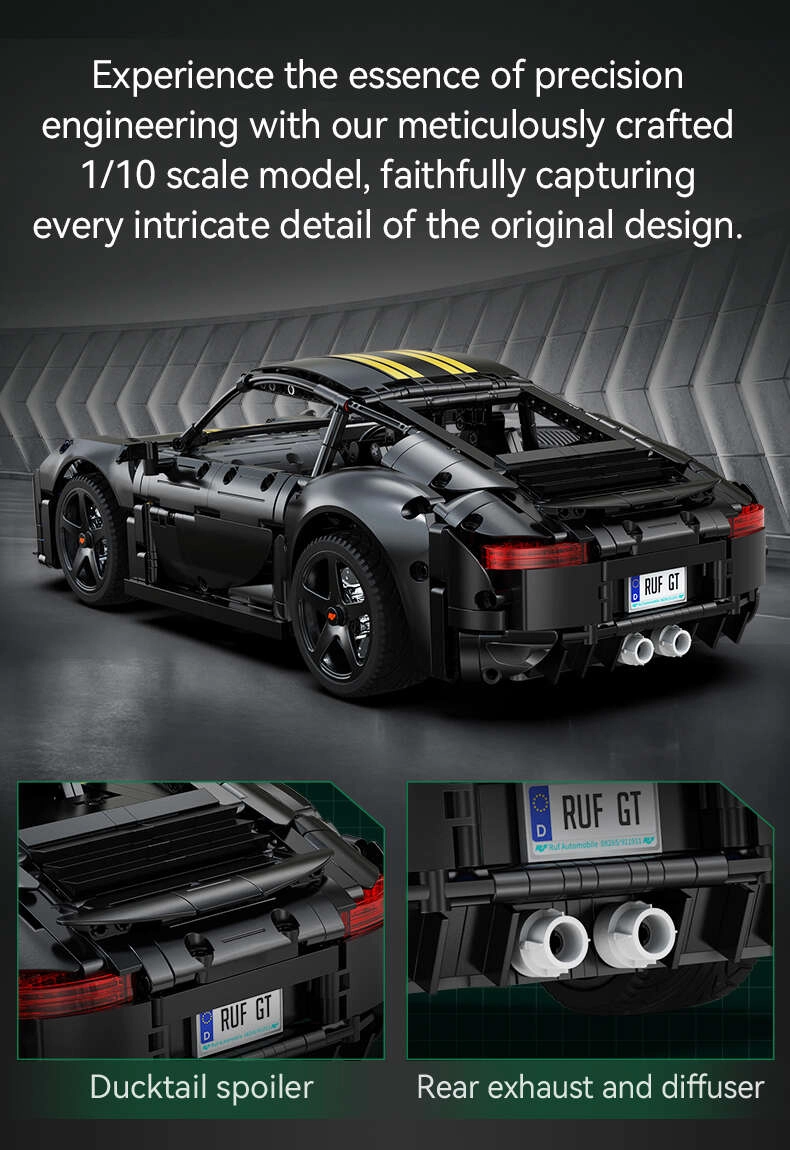 Das CaDA-Bauset aus der Reihe „Make Your Bricks Move“ begeistert anspruchsvolle Fans technischer Modelle. Das präzise ausgearbeitete Modell RUF GT verbindet realistische Funktionen mit ansprechendem Design: öffnende Elemente, Lenkung, Federung und ein detailliertes Interieur. Im Maßstab 1:10 überzeugt es sowohl als Sammlerstück als auch als actionreiches Spielmodell.