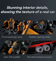Dieses große Modell aus der Reihe CaDA Master begeistert jeden Fan technischer Bausätze. Der Superwagen Assassin XR, entworfen vom Designer Pvdb, besticht durch eine präzise ausgearbeitete Karosserie in Orange mit schwarzen Akzenten und beeindruckenden Details – vom Cockpit mit zwei Sitzen und Lenkrad bis hin zu stilvollen Auspuffanlagen und realistischen Proportionen.