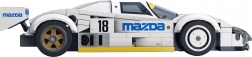 Getreue Details des legendären MAZDA 787B in Weiß mit blau–gelben Aufklebern und markantem Heckflügel begeistern jeden Motorsportfan.