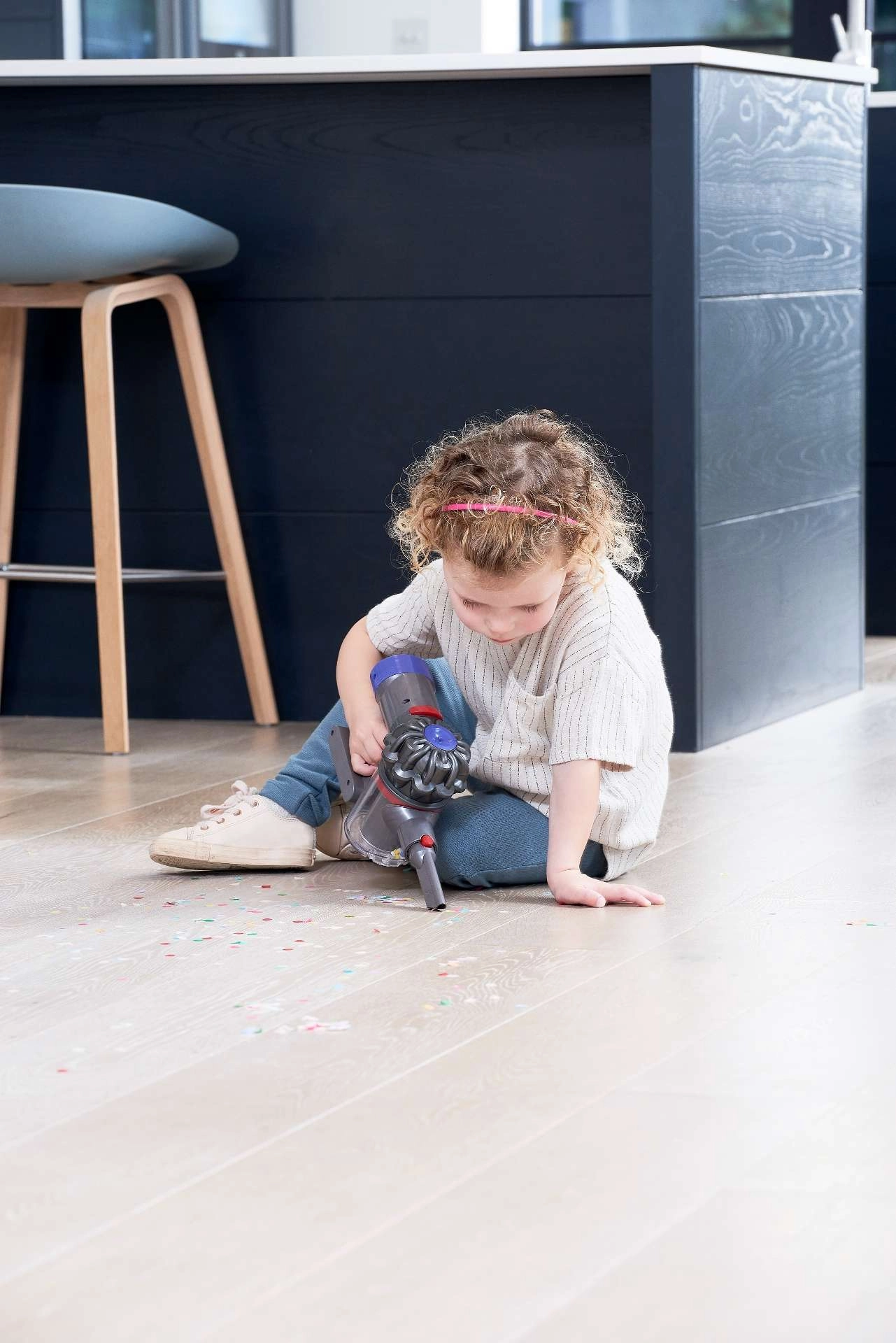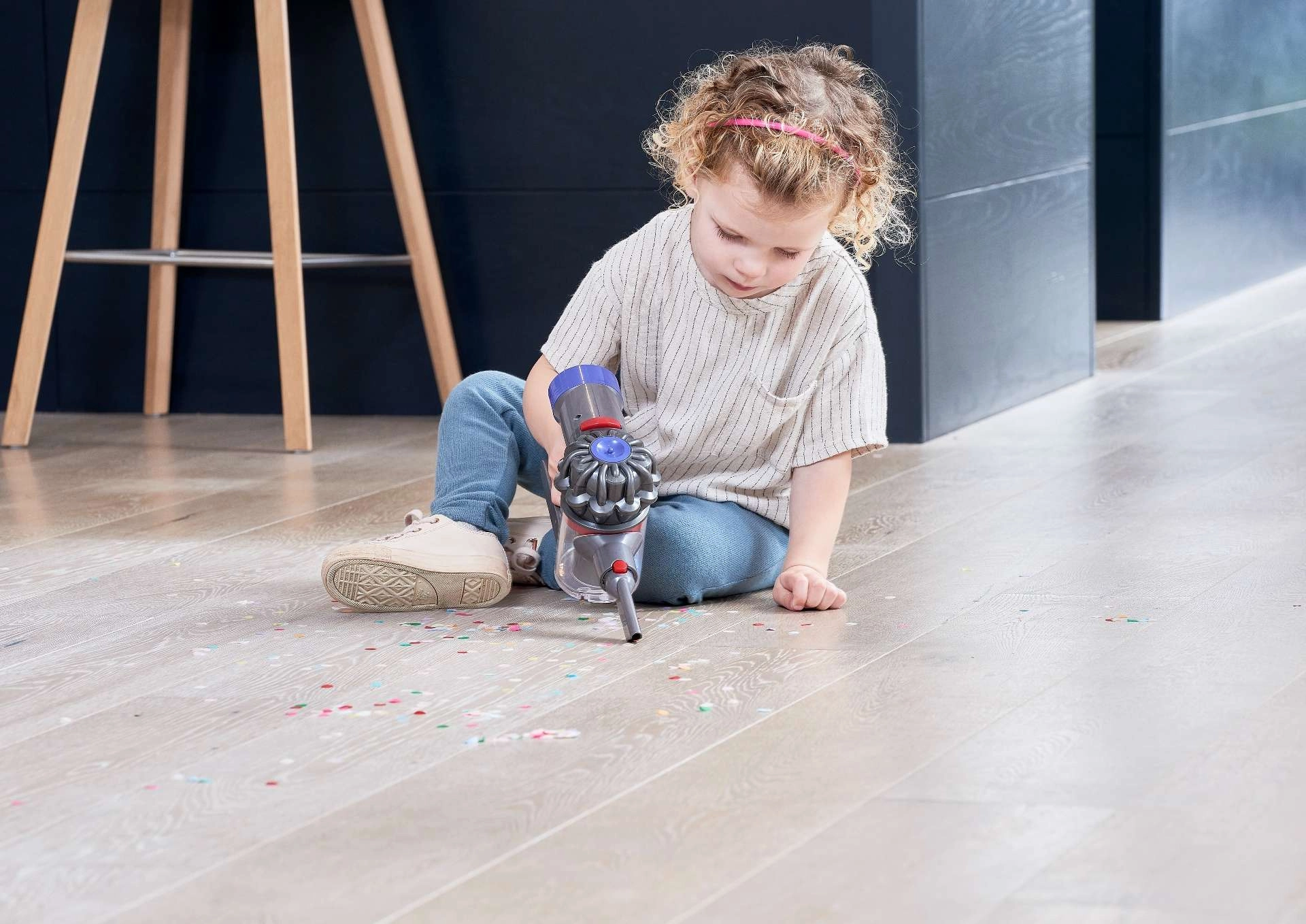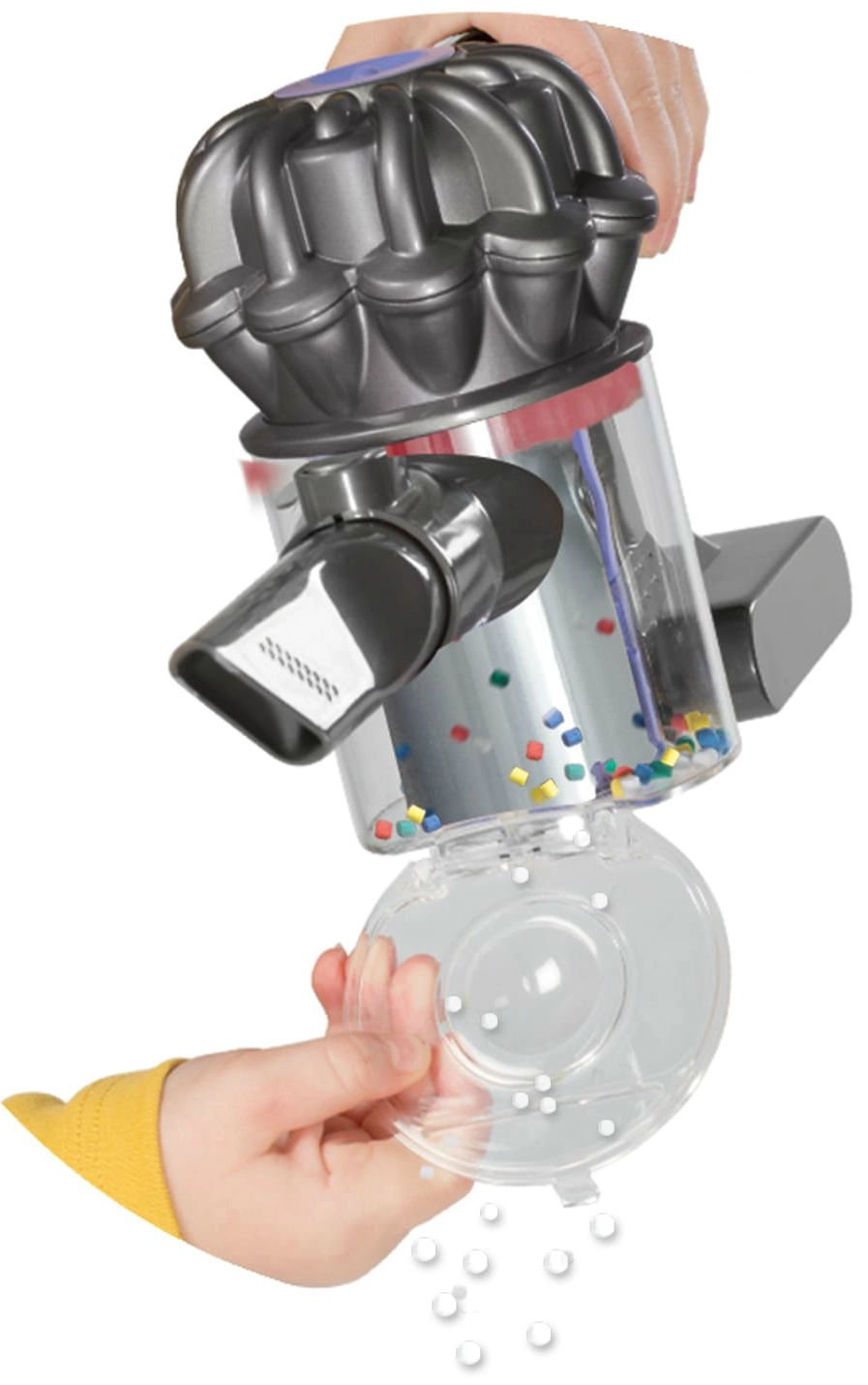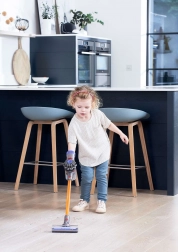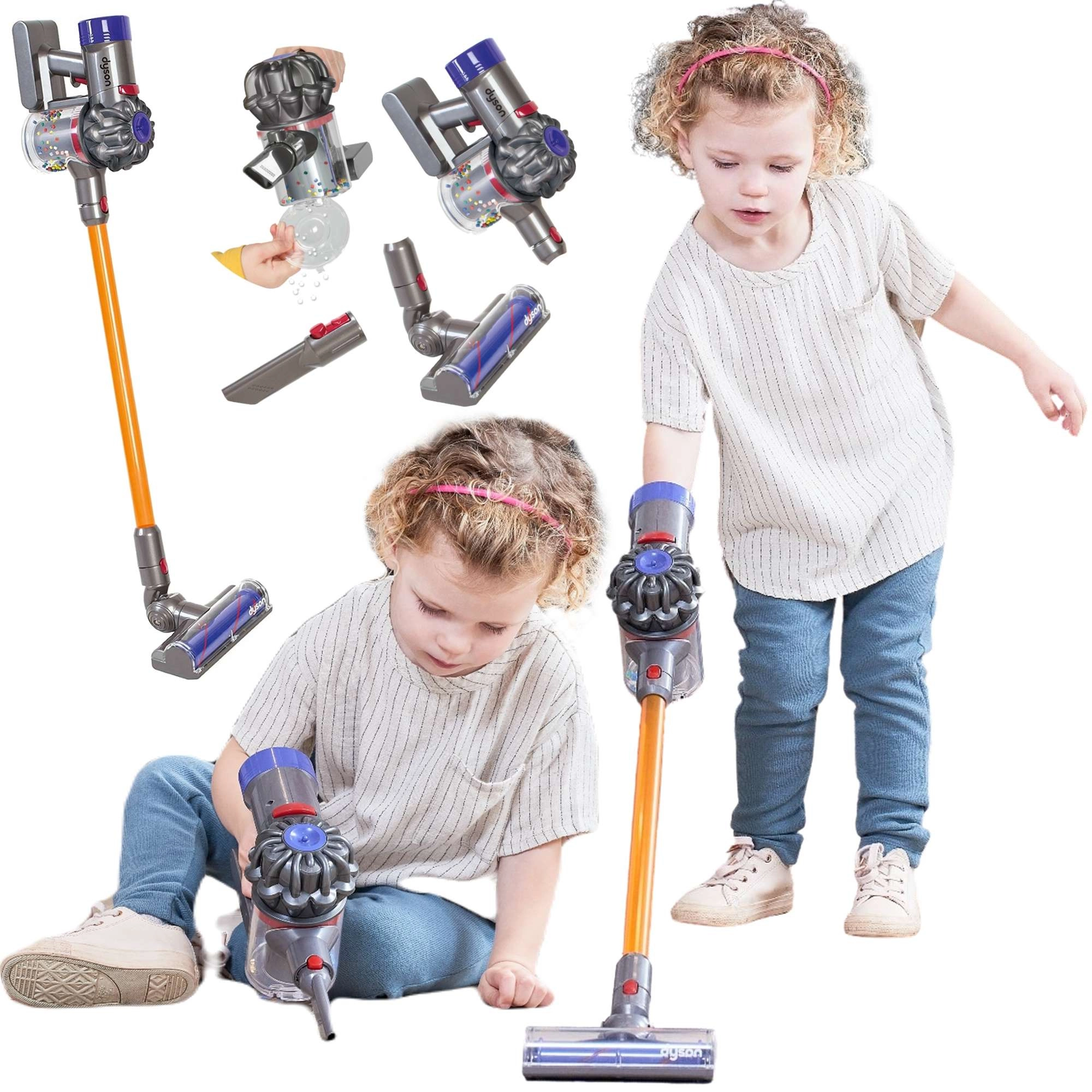 Authentischer Look mit schlankem Stab, transparentem Behälter und einem Kopf für das „Reinigen“ von Böden vermittelt Kindern das Gefühl, wirklich im Haushalt zu helfen.
