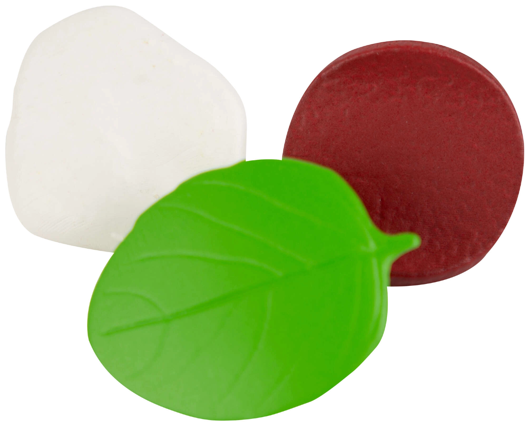 - 18 Toppings (Käse, Tomaten, Basilikumblätter u. a.)