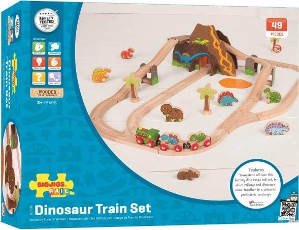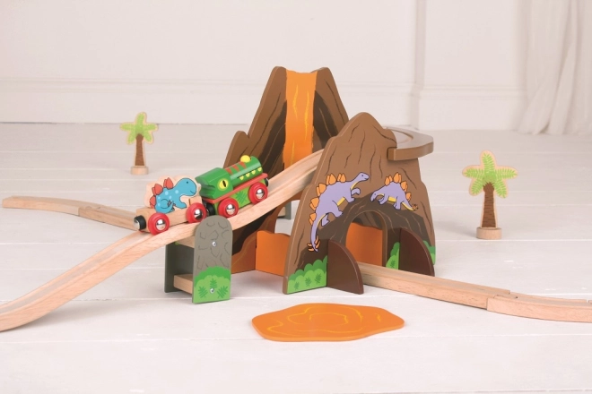 Erleben Sie Abenteuer in der Urzeit mit einer Eisenbahn, in der sich Schienennetz und Dinosaurier begegnen. Kinder bauen eine Runde um den Vulkan mit Tunnel, fahren mit dem Dinosaurierzug und erschaffen eigene Geschichten mit den farbenfrohen Figuren. Die Holzteile sind robust, angenehm anzufassen und ideal für den täglichen Spielspaß.