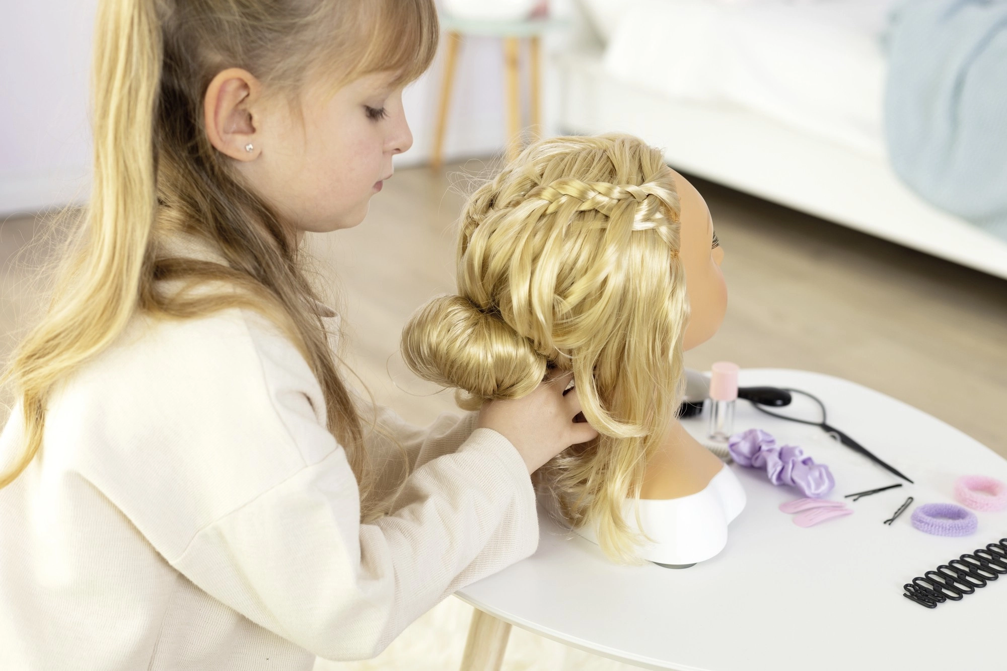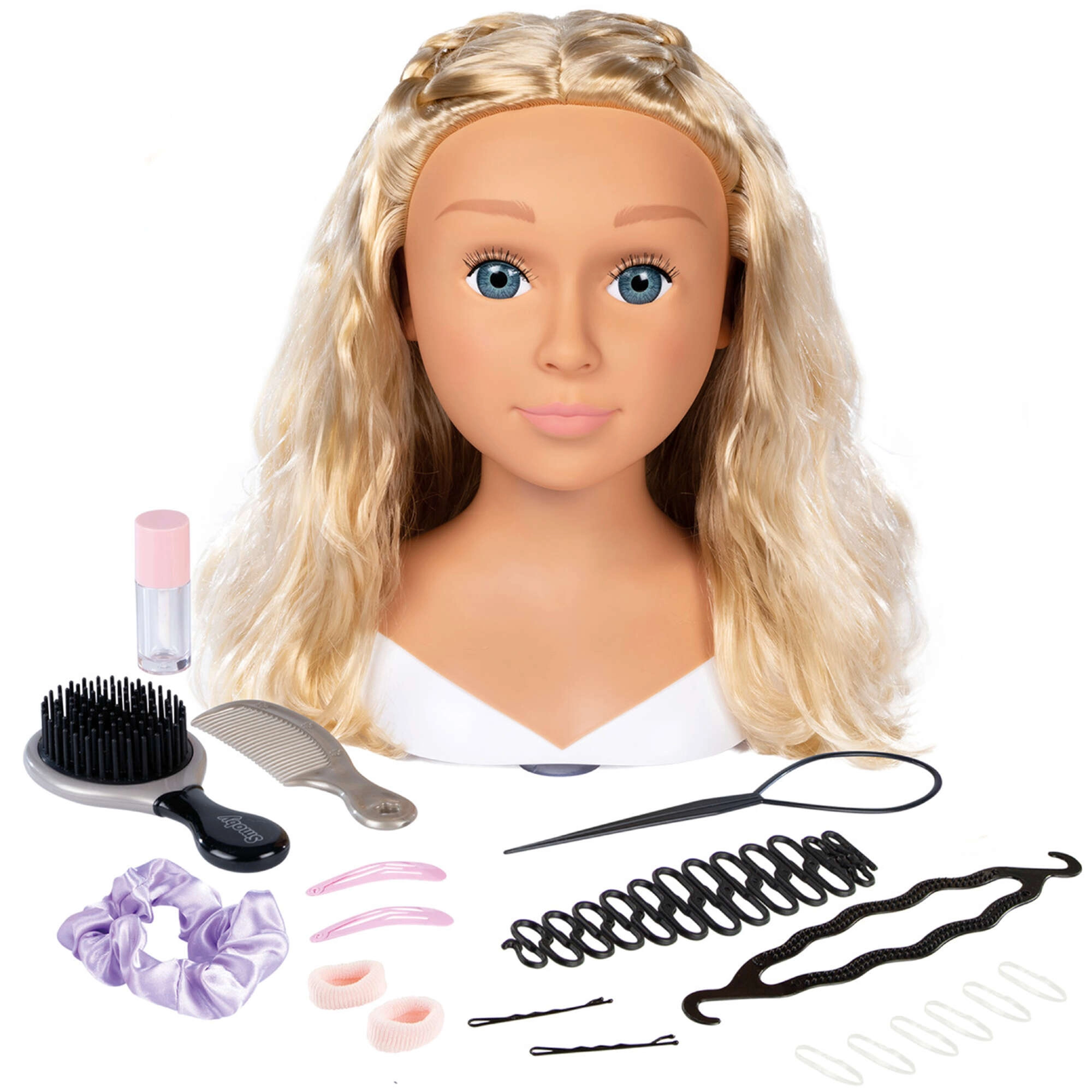Dieser realistische Stylingkopf ist ein ideales Hilfsmittel für kleine Friseurinnen und Make-up-Artists. Die langen, glänzenden synthetischen blonden Haare behalten ihre Form, lassen sich immer wieder kämmen, flechten und zu zahlreichen Frisuren stylen. Die stabile Basis erleichtert die Arbeit und Accessoires wie Bürste, Kamm, Spangen, Haargummis oder Flechthilfen eröffnen grenzenlose Kreativität.