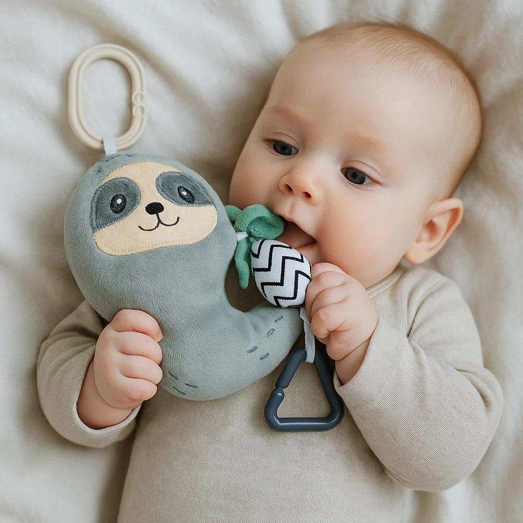 Integrierte Rasseln fördern die auditive Wahrnehmung und regen zur Interaktion an. Das Spielzeug besteht aus hochwertigen und sicheren Materialien, ist für Kleinkinder geeignet und leicht zu reinigen. Perfekt als Zubehör für Kinderwagen, Autositz oder das Kinderbett.