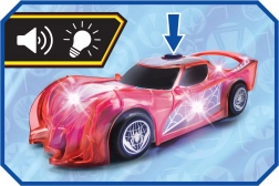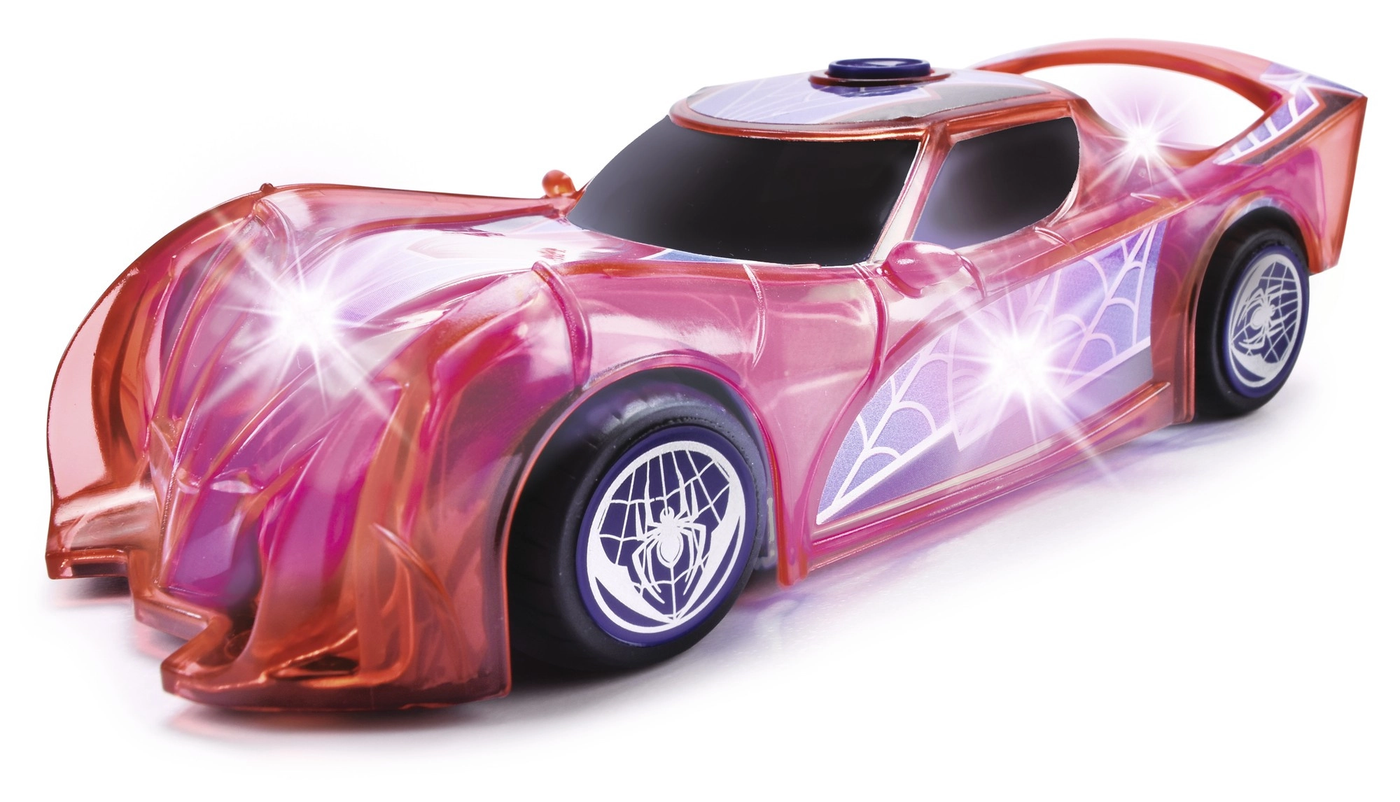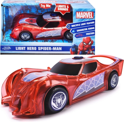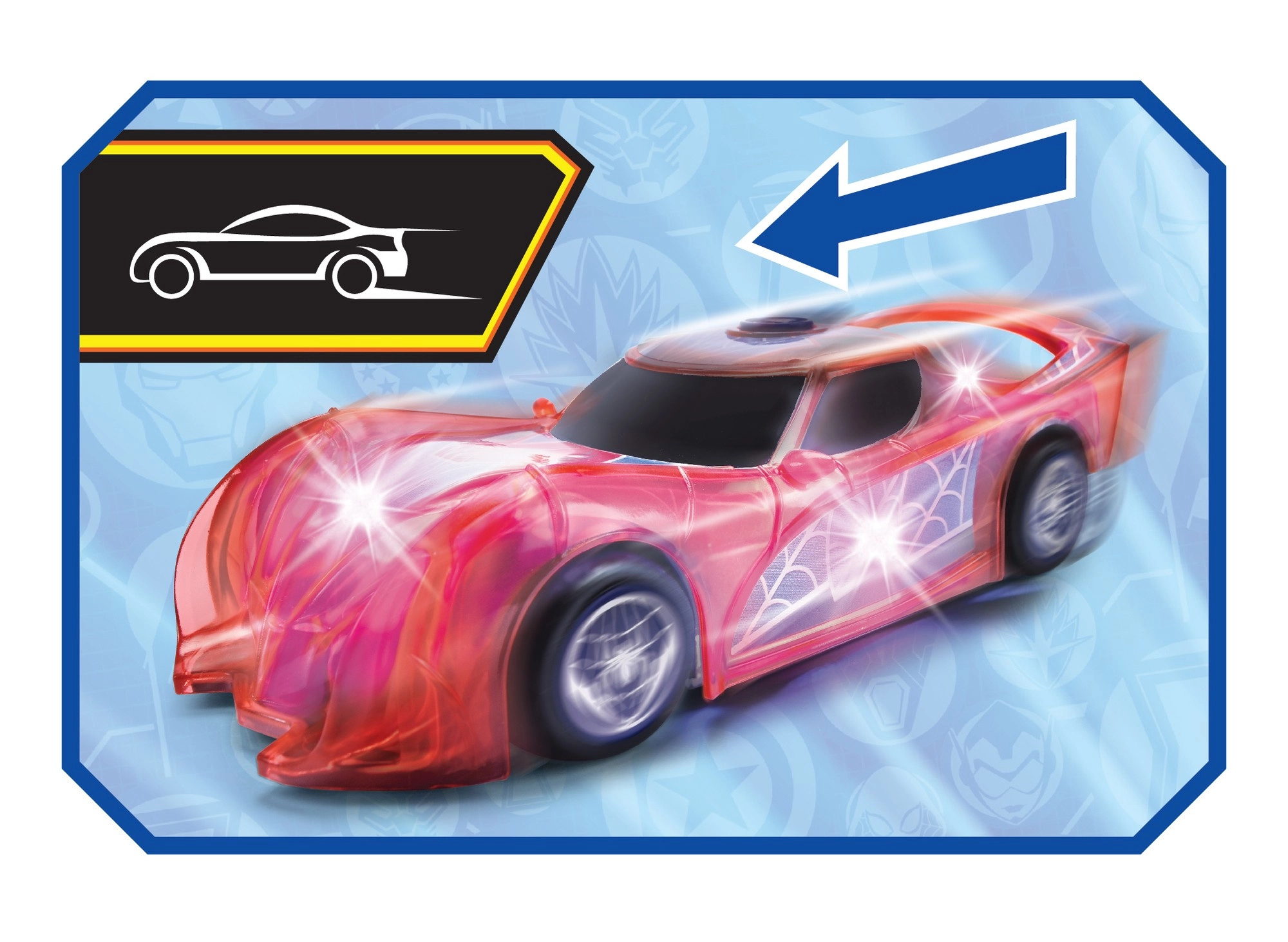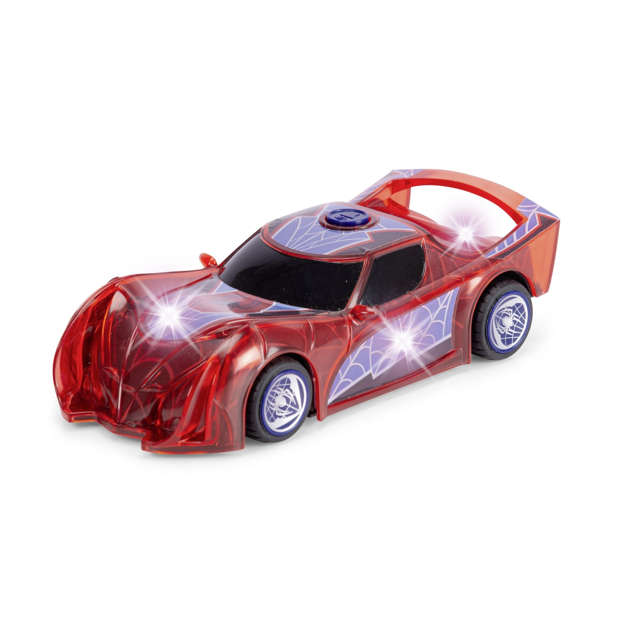 Das Superhelden‑Auto SPIDER‑MAN in charakteristischem Rot mit Spinnennetz‑Details besticht durch sein transluzentes Design und integrierte LED‑Lichter, die jedes Abenteuer erhellen. Der einfache Push‑and‑Go-Mechanismus (Friktionsantrieb) braucht nur einen leichten Schubs und das Auto startet nach vorn.
