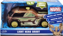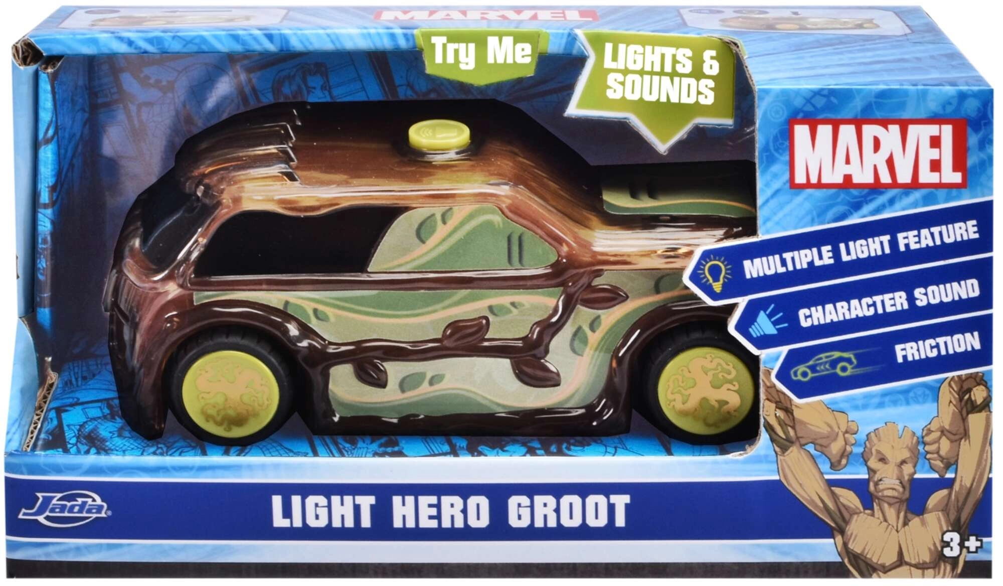 Entdecken Sie das Action-Auto mit GROOT-Motiv von MARVEL, das interaktive Licht- und Soundeffekte mit einem originellen, von Holz, Blättern und Zweigen inspirierten Naturdesign verbindet. Kinder aktivieren die Effekte ganz einfach durch Drücken des gelben Knopfes auf dem Dach und können sich auf abenteuerliche Missionen der Avengers begeben.