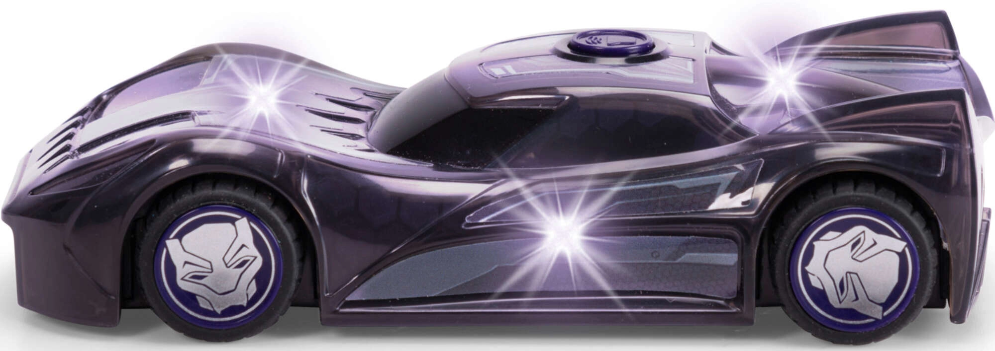 Starten Sie in eine actionreiche Fahrt mit dem MARVEL Black Panther-Auto. Die Karosserie mit Maskenmotiv und futuristischen Linien trifft den Stil des beliebten Helden. Per Druck auf die violette Taste aktivieren sich leuchtende Effekte über die gesamte Karosserie und authentische Sounds des Fahrzeugs und der Figur für ein noch intensiveres Spielerlebnis.