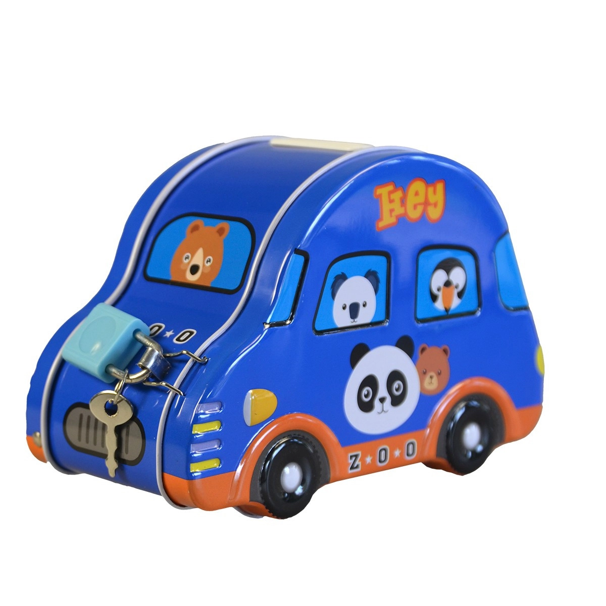 Diese Kindersparbüchse in Autoform kombiniert ein verspieltes Design mit praktischer Sicherheit. Die Ausführung aus Metall ist langlebig und die farbigen Tiermotive fallen sofort ins Auge. Oben befindet sich ein Schlitz zum Einwerfen von Münzen, hinten oder vorne ein kleines Schloss mit Schlüsseln zur Sicherung des Ersparten.