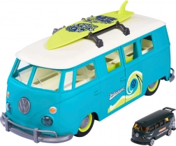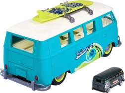 Abnehmbares Surfbrett auf dem Dachträger und liebevolle Karosseriedetails im Retro-T1-Stil begeistern kleine Surfer und Sammler.