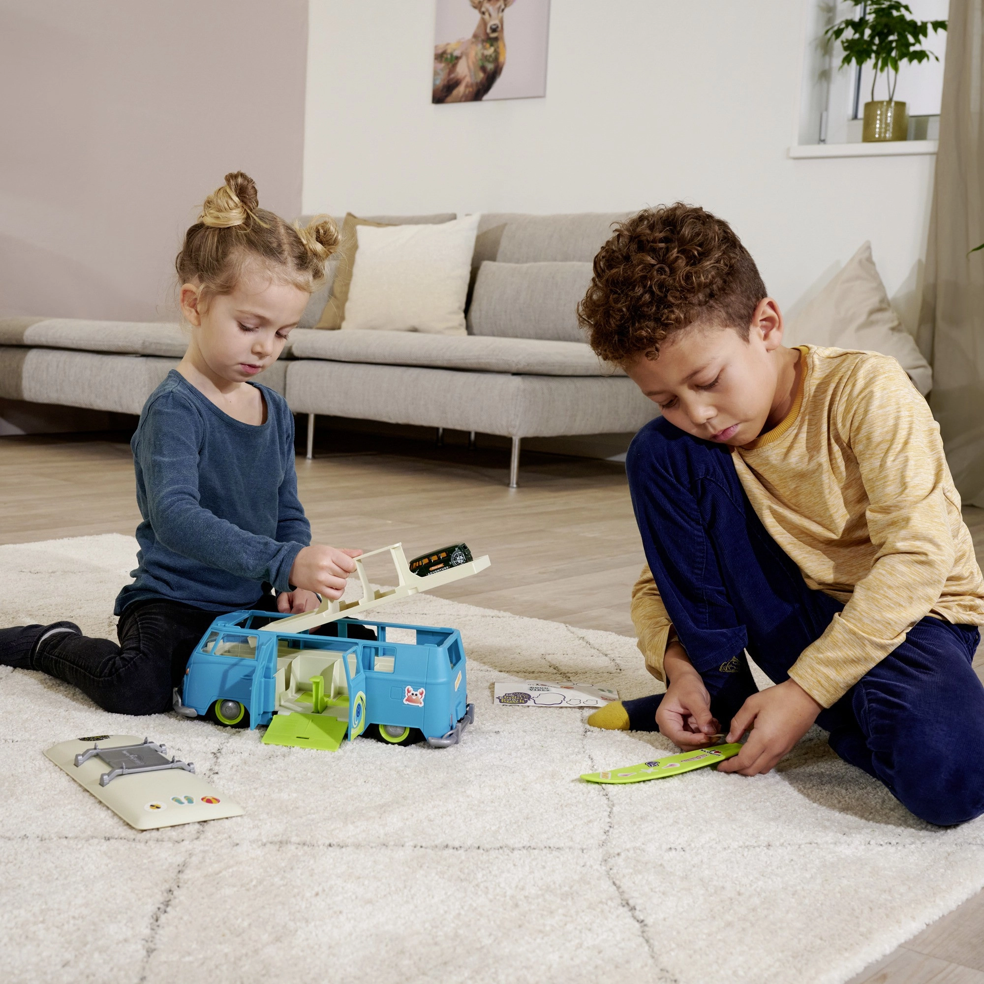 Das Dach ist abnehmbar, auf dem Träger befindet sich ein abnehmbares Surfbrett, und das Heck hat eine aufklappbare Klappe mit „Motor“-Bereich. Robuster Kunststoff eignet sich für den täglichen Spielspaß und fördert Feinmotorik und Fantasie von Kindern ab 3 Jahren.