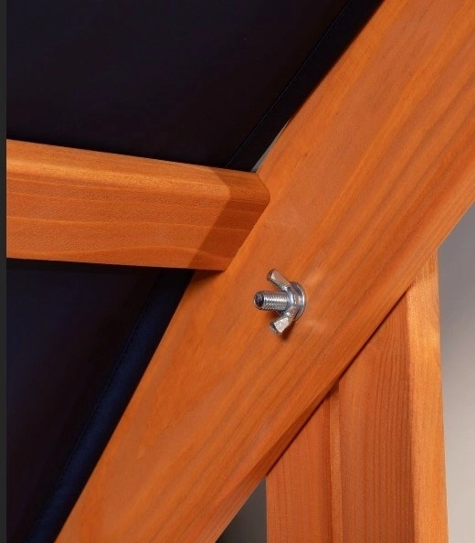Alle Holzteile sind mit zugelassener, wasserbasierter Imprägnierung geschützt, die für Kinder geeignet ist. Dank Mikropigmenten behält das Dach langanhaltend eine attraktive Optik und Widerstandsfähigkeit gegenüber Witterungseinflüssen. Die Konstruktion ist für eine schnelle Installation vorbereitet – vorgebohrte Löcher, Befestigungsmaterial und eine gedruckte Anleitung sind im Lieferumfang enthalten.