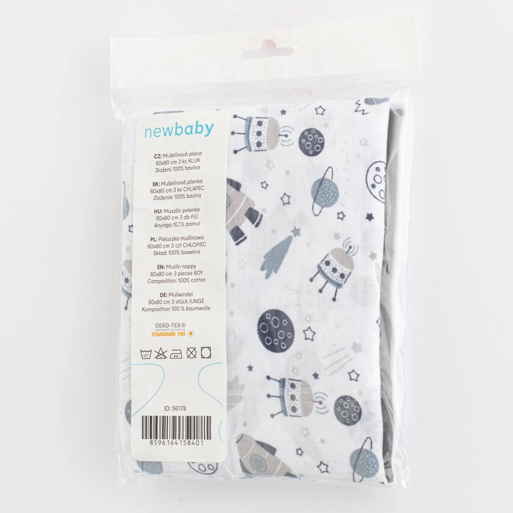 Die Windeln sind multifunktional – sie dienen als Handtücher, Unterlagen, Pucktücher oder als leichte Decke für Kinderwagen oder Bettchen. Im Set finden Sie zwei einfarbige und eine mit einem niedlichen Print in farben, die für Jungen geeignet sind.