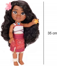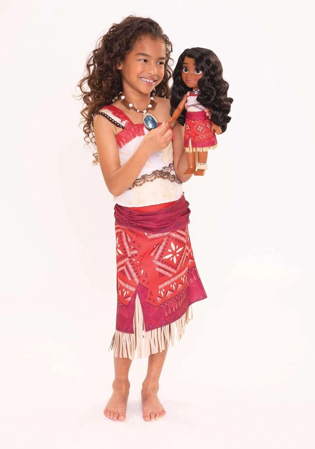 Lange, wellige Haare zum Kämmen und ein polynesisch inspiriertes Kostüm mit Filmdetails fördern Kreativität und Pflege beim Spielen.