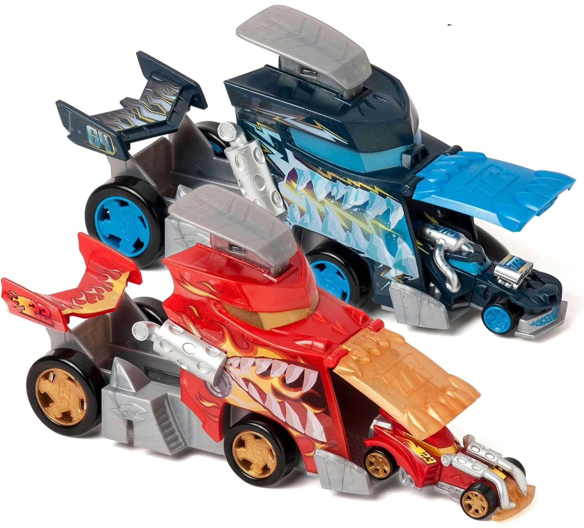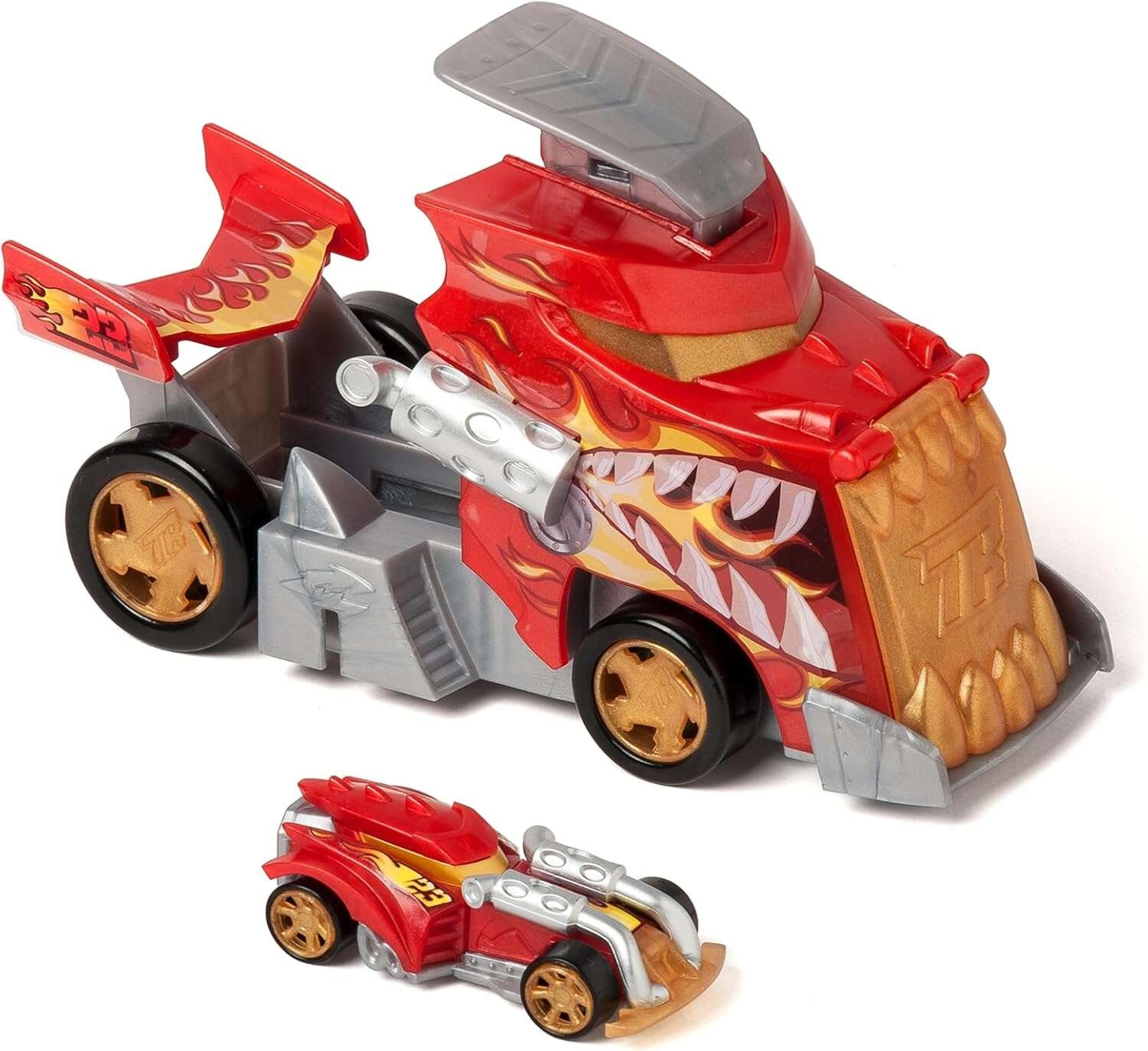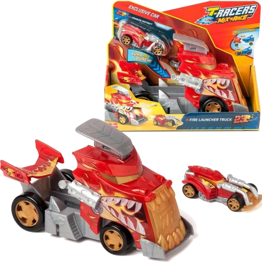 Das Set T-Racers Mix ’N Race Fire Launcher Truck bringt Kindern dynamische Rennen und kreative Freiheit. Der dracheninspirierte Lastwagen transportiert deine Autos und schickt sie dank der integrierten Abschussrampe mit Blitzgeschwindigkeit nach vorne. Enthalten ist außerdem ein exklusives Rennfahrzeug, dessen Teile mit weiteren Modellen der Mix ’N Race Reihe kombinierbar sind.