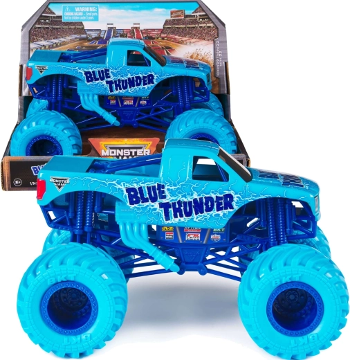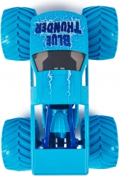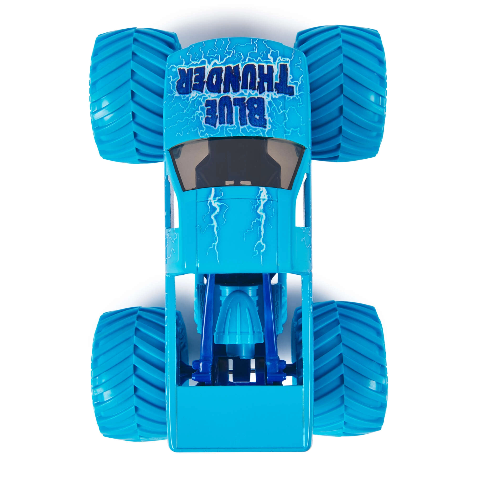 Das stabile Metallchassis mit den charakteristischen Blue-Thunder-Blitzen und der offiziellen MONSTER JAM Lizenz sorgt für authentische Optik und Haltbarkeit bei intensivem Spiel.