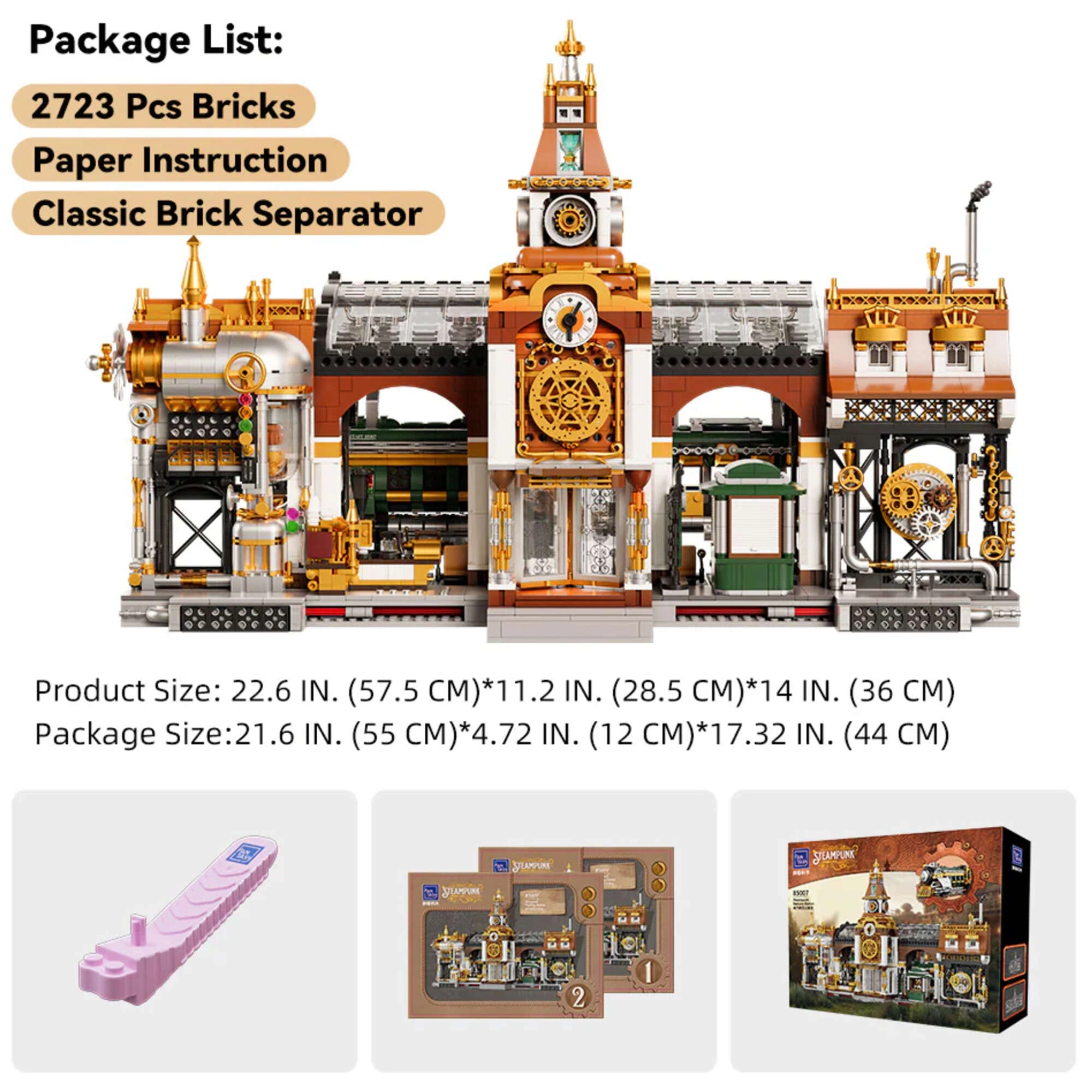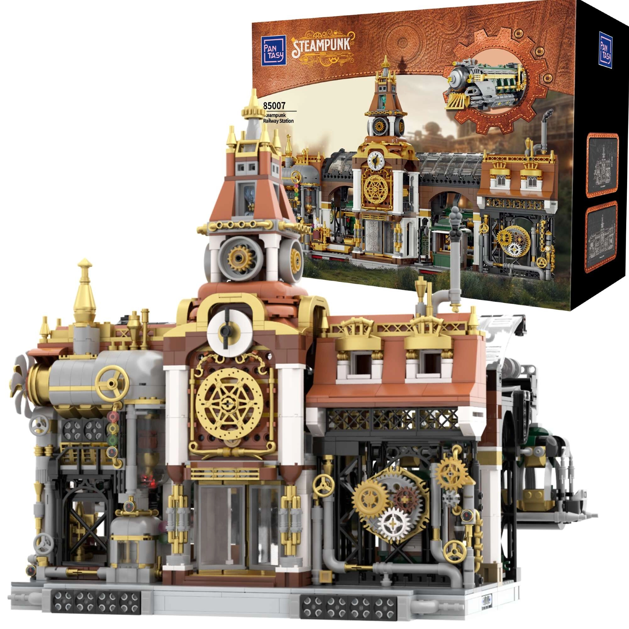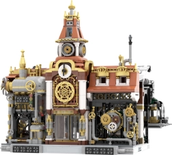 Tauchen Sie ein in die Atmosphäre des Zeitalters der Dampfkraft. Dieser detailreiche Steampunk-Bahnhof kombiniert Messing- und Bronzetöne mit industriellen Akzenten und vermittelt den authentischen Charakter von Dampfmaschinen. Präzise gestaltete Zahnradgetriebe, Rohrleitungen und Fassadendekor machen das Modell zu einem markanten Highlight jeder Sammlung und jedes Interieurs.