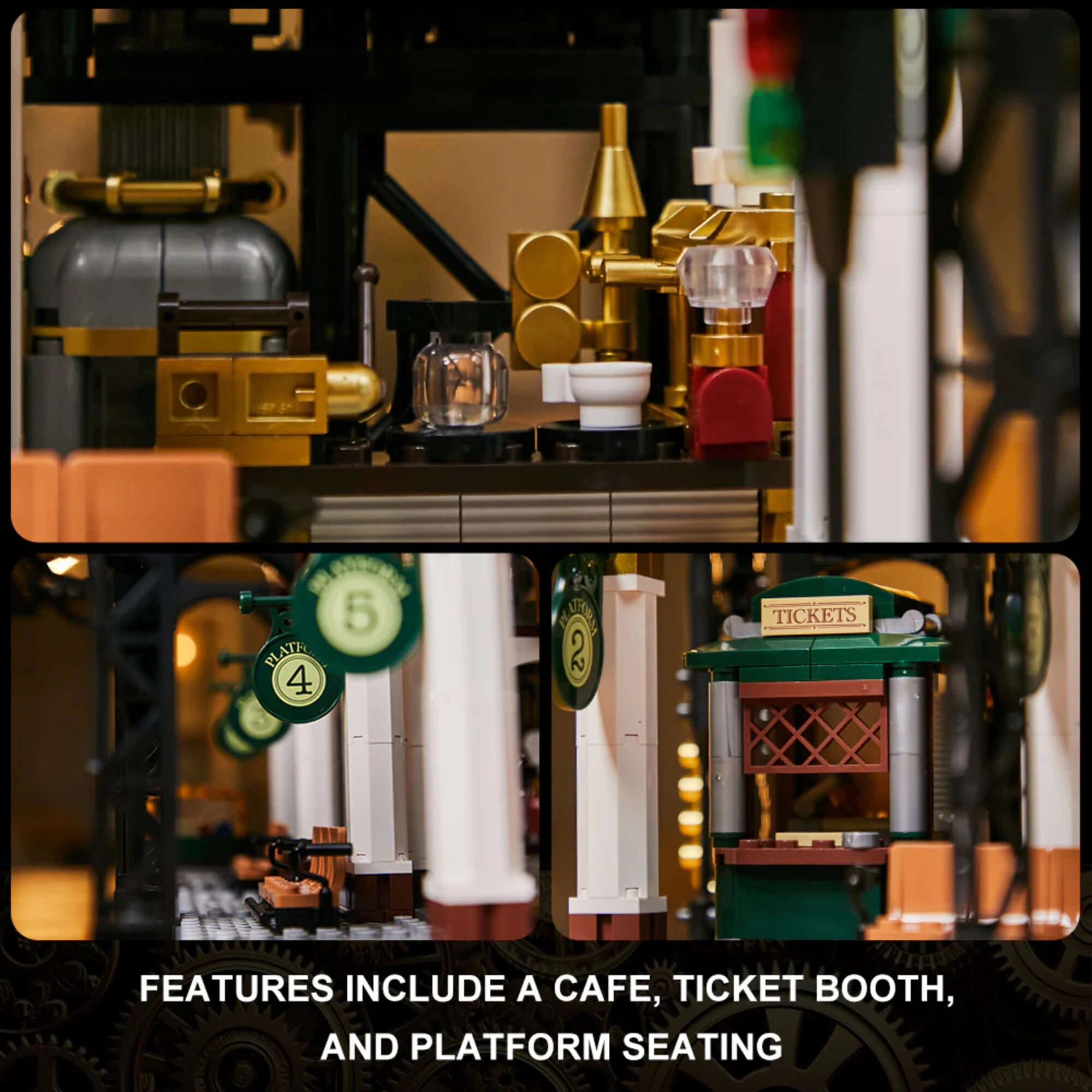 Der Bausatz aus robustem ABS bietet eine modulare Konstruktion für variable Anordnung und interaktive Elemente, die das Modell zum Leben erwecken. Im Inneren entdecken Sie sorgfältig ausgearbeitete Details – beleuchtete Gleise, Motive von schwebenden Zügen, bequeme Sitzbänke im Wartesaal sowie stilvolle Fahrpläne, Karten und Plakate. Die auf Steine gedruckte Grafik sorgt dauerhaft für ein sauberes, ästhetisches Erscheinungsbild ohne abblätternde Aufkleber.