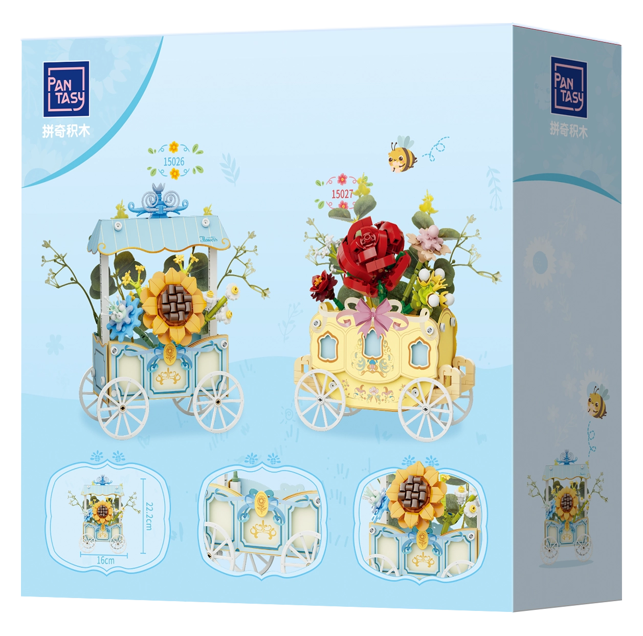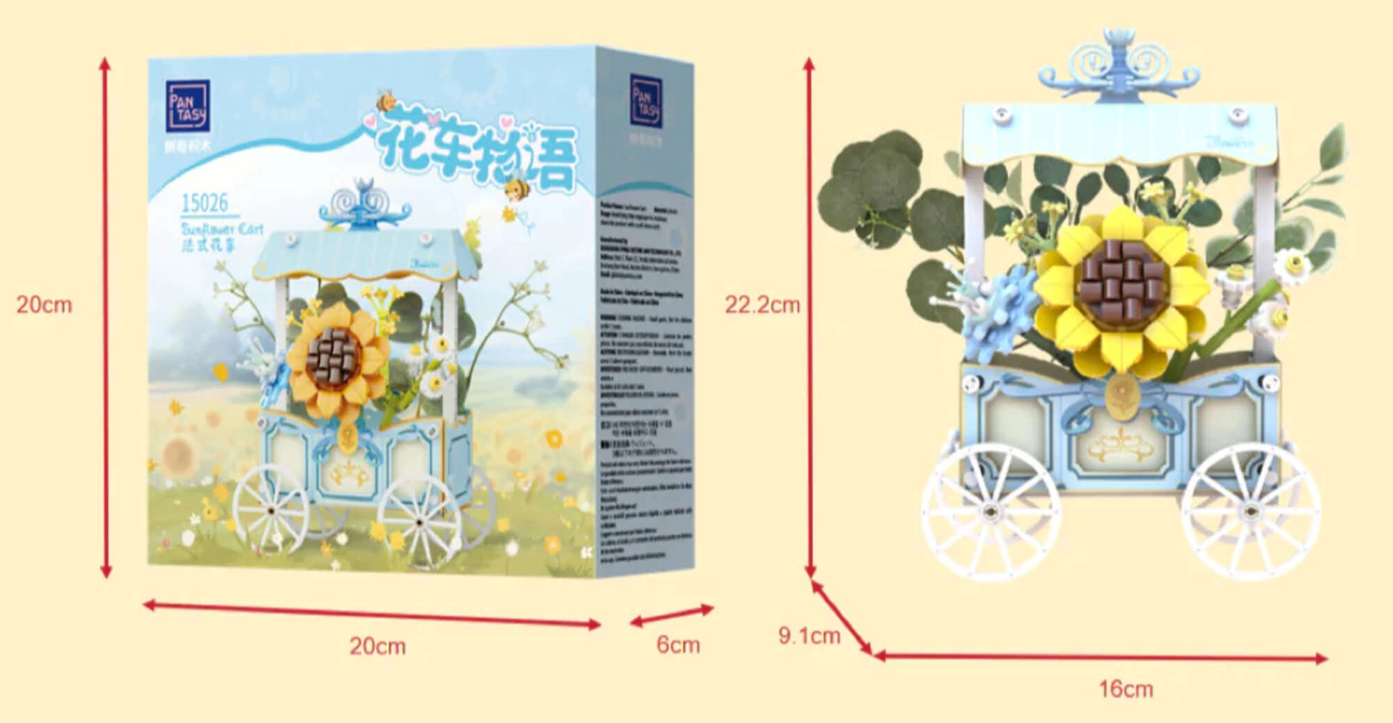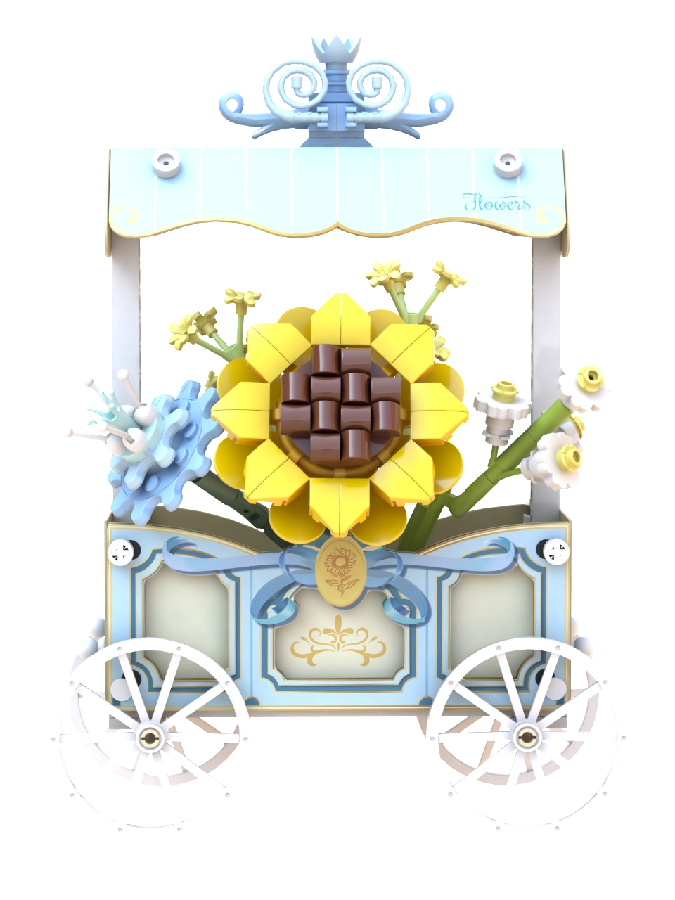 Dieses raffinierte Modell vereint kreatives Bauen und dekoratives Design. Der Wagen mit vier Speichenrädern wird von einem gestreiften Dach, feinen Ornamenten und einer markanten Sonnenblume mit weiteren Blumen geschmückt. Alle Motive sind direkt auf die Teile gedruckt und bleiben so dauerhaft schön.