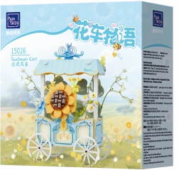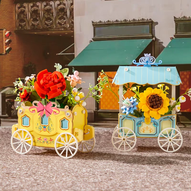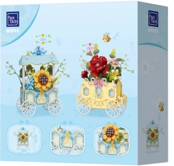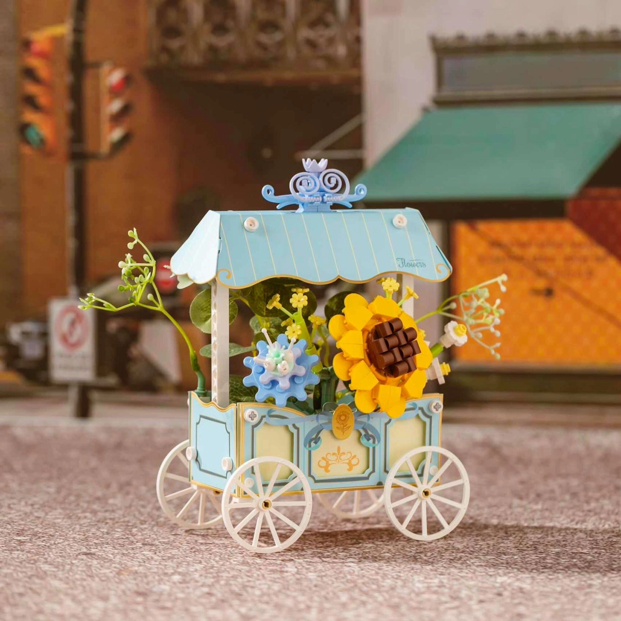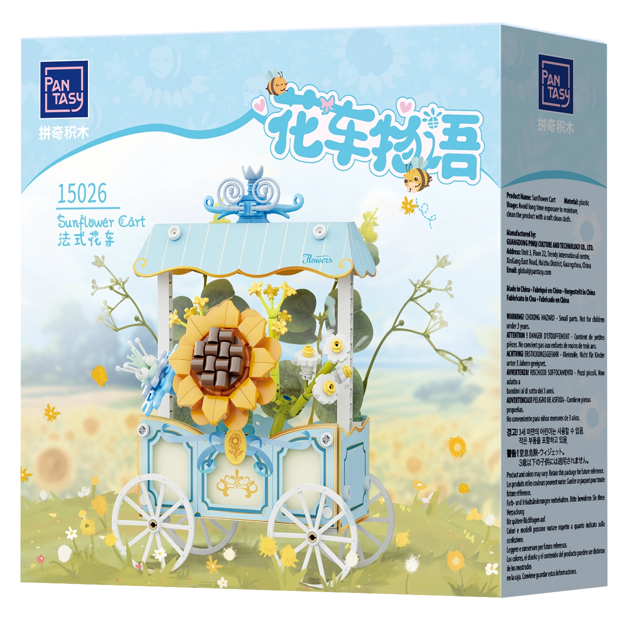 Dieses raffinierte Modell vereint kreatives Bauen und dekoratives Design. Der Wagen mit vier Speichenrädern wird von einem gestreiften Dach, feinen Ornamenten und einer markanten Sonnenblume mit weiteren Blumen geschmückt. Alle Motive sind direkt auf die Teile gedruckt und bleiben so dauerhaft schön.