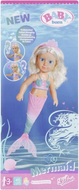 Entdecken Sie die Geheimnisse der Unterwasserwelt mit der BABY born Meerjungfrauen-Puppe. Sobald sie ins Wasser eintaucht, gleitet sie elegant und bewegt ihre bunte Flosse. Ihr Zauber ist der Farbwechsel: In kaltem Wasser verwandelt sich Rosa in Türkis und Türkis in Blau – so wird jedes Bad zu einem magischen Erlebnis.