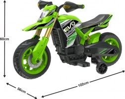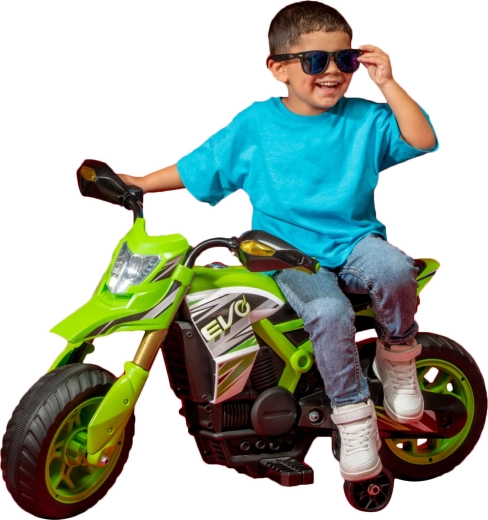 Entdecken Sie das sportliche Design und die realistischen Details des EVO Venom, die Kinder und Eltern begeistern. Vom echten Motorrad inspirierter Stil, ein realistischer Scheinwerfer und eine robuste Kunststoffausführung geben Sicherheit im Sattel. Die Fahrt wird durch während der Fahrt aufleuchtende Lichter und die einfache Vorwärtsbedienung per Taste am Lenker ergänzt.