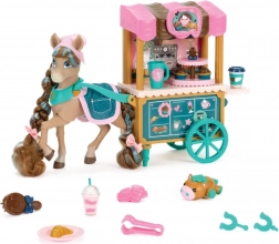 Der Wagen verfügt über drehbare Räder, einen Griff und Ablagen für Leckereien, ein farbiges Dach und Café‑Grafiken. Das Set umfasst außerdem Servier- und Backzubehör, ein kleines Haustier und eine Bürste zum Stylen der Mähne. Alles ist auf kreatives Rollenspiel, die Förderung der Feinmotorik und soziale Interaktion ausgelegt.