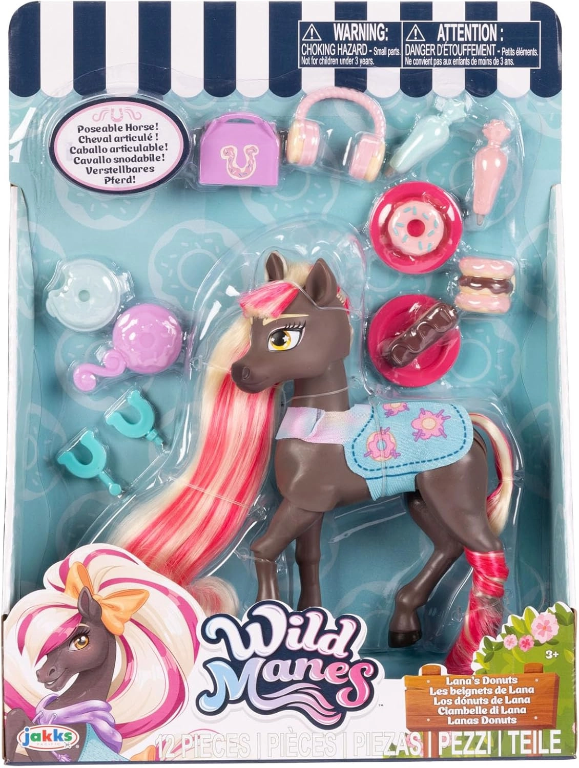 Entdecke das schokoladenbraune Pony Lana mit langer rosa‑blonder Mähne und Schweif, die zum Kämmen und Stylen einladen. Lege ihm eine blaue Decke um, schmücke es mit Accessoires und spiele Lieblingsmomente aus der Serie Wild Manes nach. Bewegliche Teile ermöglichen natürliche Posen und ein realistisches Spielerlebnis.