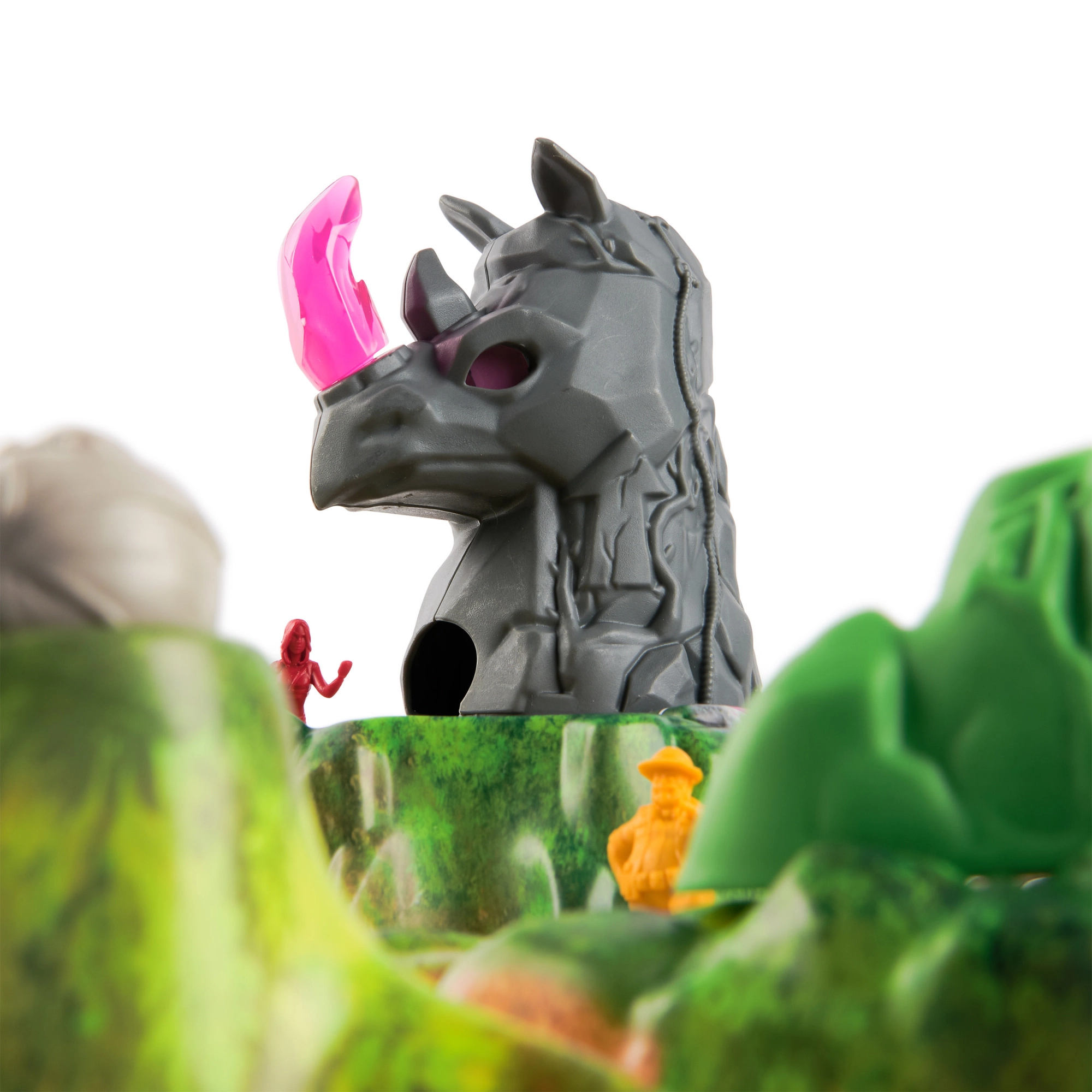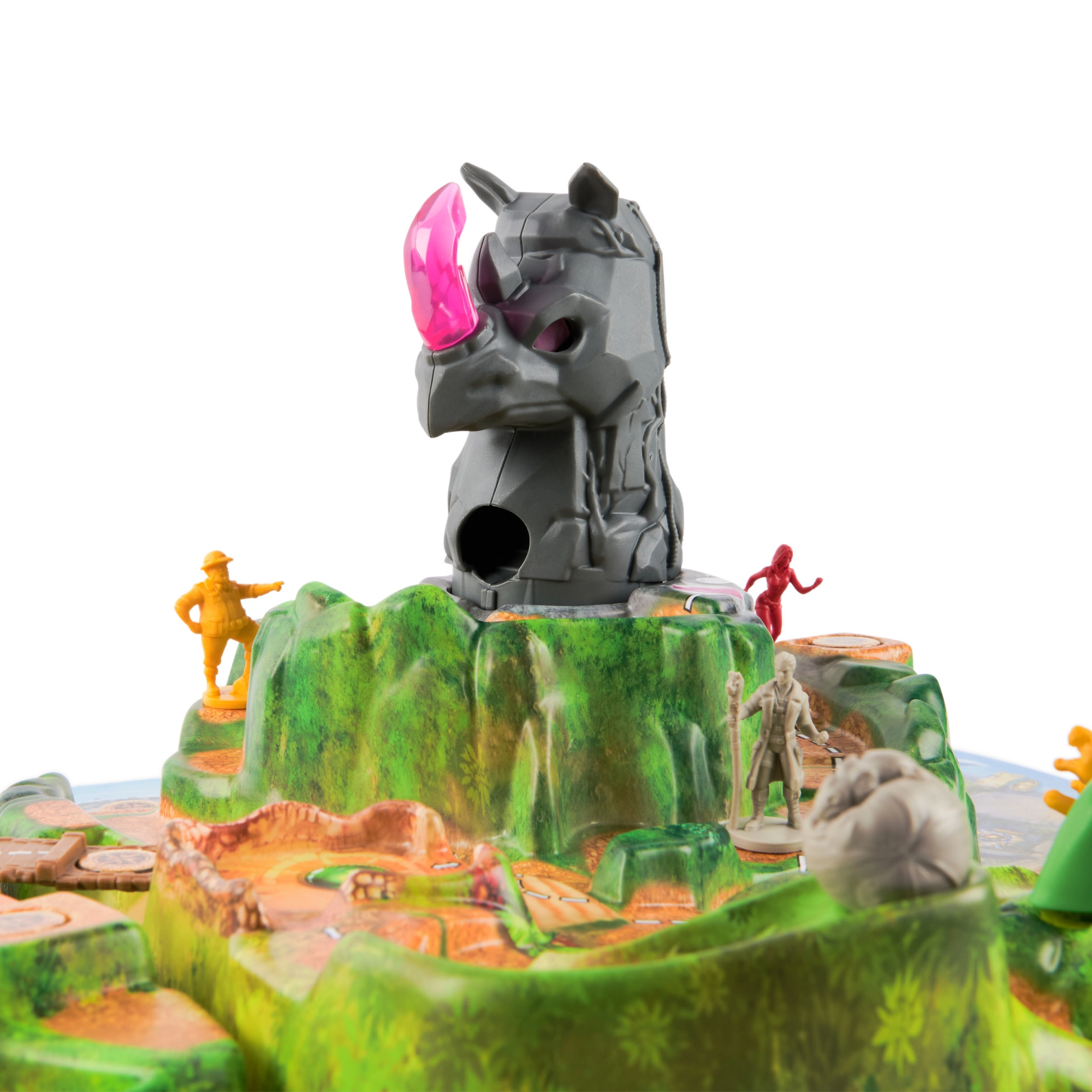 Das Highlight des Spielplans ist der markante 3D-Nashornberg mit einem Kristallhorn. Erhöhtes Gelände, Brücken und Wege schaffen ein fesselndes Abenteuer und einen klar geführten Spielablauf.