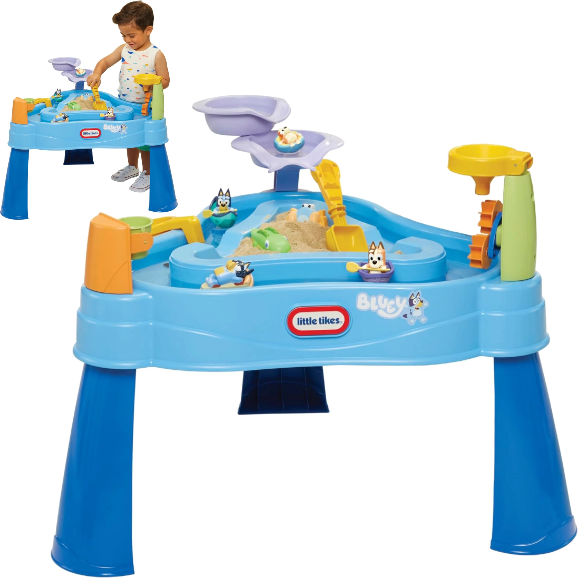Der LITTLE TIKES BLUEY Tisch bringt einen umfangreich ausgestatteten Wasser- und Sandspielplatz direkt auf Ihren Garten, die Terrasse oder den Balkon. Der äußere Ring bildet eine spaßige „gemächliche Flussbahn“ zum Eingießen, Schöpfen und Planschen, während die innere dreieckige Kammer ideal für Sand oder zusätzliches Wasser ist. Zwei kaskadenförmige Becken, ein Überschütteimer und ein Trichter mit drehenden Rädern fördern die Sinne und die natürliche Neugier der Kinder.