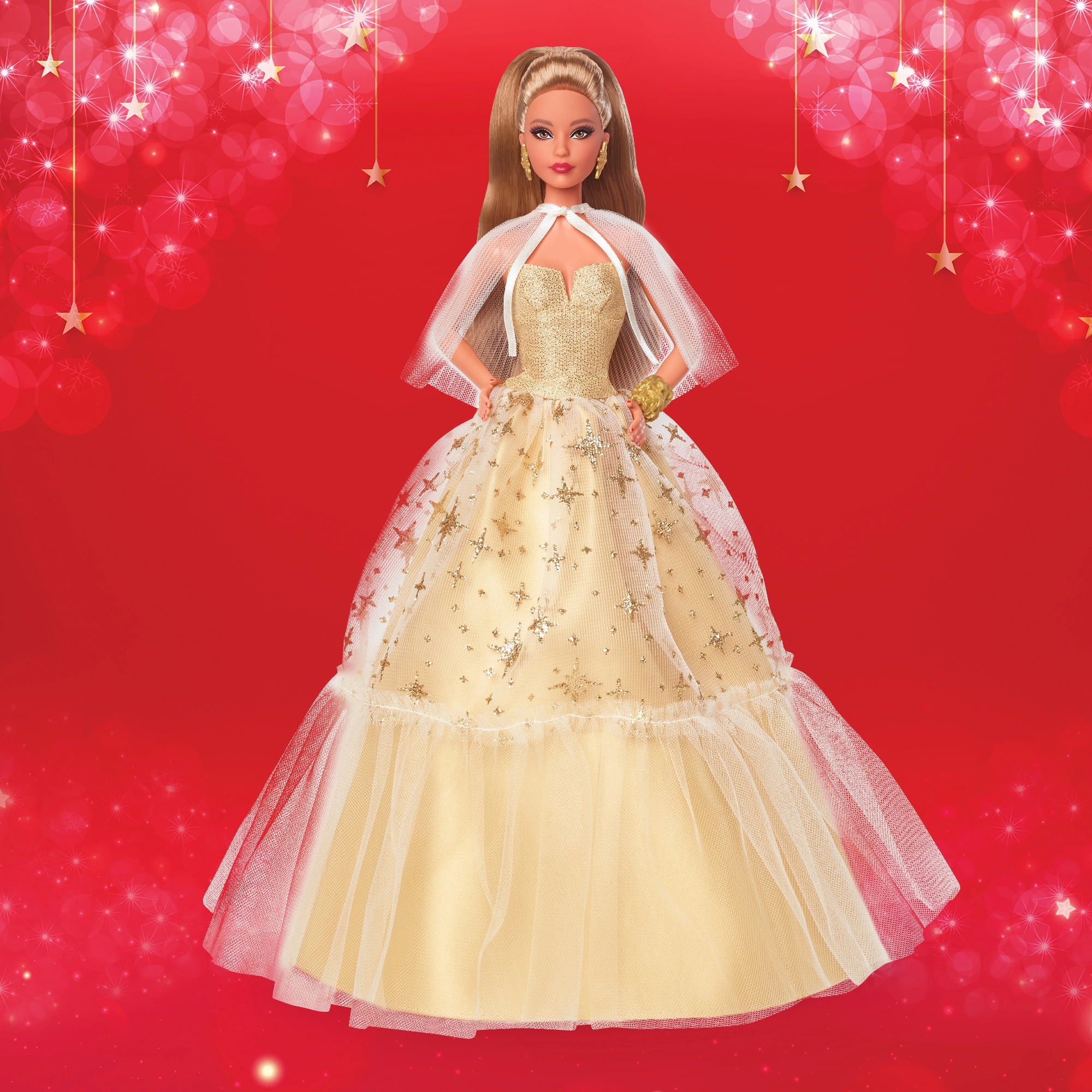 Das Outfit besteht aus einem satinierten Kleid in Champagnerfarbe mit Tüllrock mit goldenen Sternen, dazu passt eine plissierte, halbtransparente Pelerine, gebunden mit einem Satinband in Elfenbein. Die geschmackvolle Verpackung macht sie zu einem idealen Geschenk zu Weihnachten 2023 und zu einem wunderschönen Vitrinenstück.