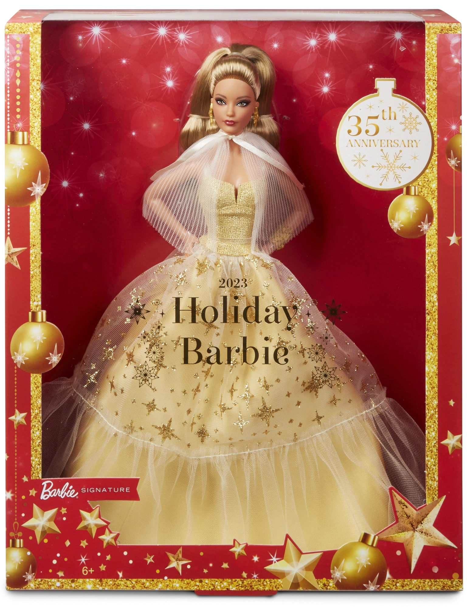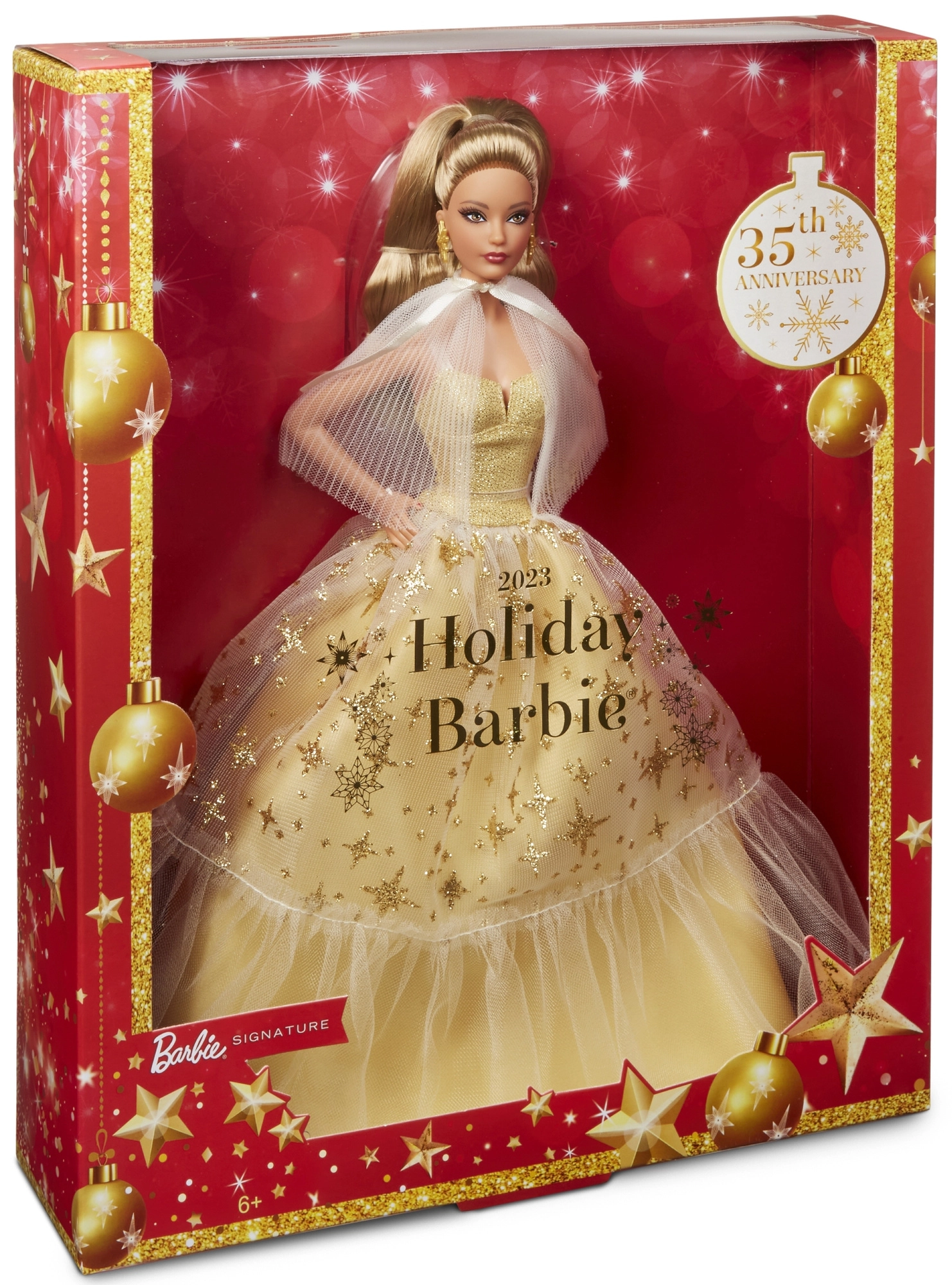 Diese außergewöhnliche Sammler-Edition feiert 35 Jahre der ikonischen Barbie-Reihe. Die Puppe besticht durch einen raffinierten Look: etwas dunkleres blondes Haar, klar braune Augen und ein ausdrucksstarkes Gesicht, das ihren gereiften Charakter unterstreicht. Elegante goldene Ohrringe und rote Nägel runden den festlichen Stil ab.