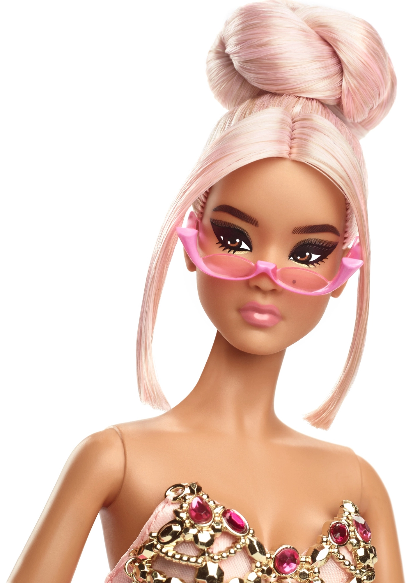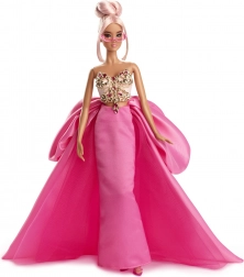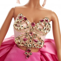 Entdecken Sie Eleganz auf den ersten Blick: eine schillernde rosa Abendrobe mit üppiger Schleppe, ein mit Schmucksteinen verziertes Korsett in Goldton und modernes Styling mit rosafarbener Brille verleihen der Puppe einen ikonischen Ausdruck. Präzises Make-up, ausgearbeitete Accessoires und die Möglichkeit zum Posieren betonen jedes Mode-Detail.