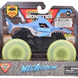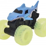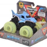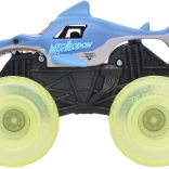 Der beliebte Megalodon, inspiriert vom prähistorischen Hai, überzeugt mit realistischen Karosseriedetails in Blau‑Grau-Tönen, Flossen und Zähnen, die den aggressiven Look unterstreichen. Große, transparent getönte Räder und ein robustes Chassis eignen sich ideal für Stunts zu Hause und unterwegs.