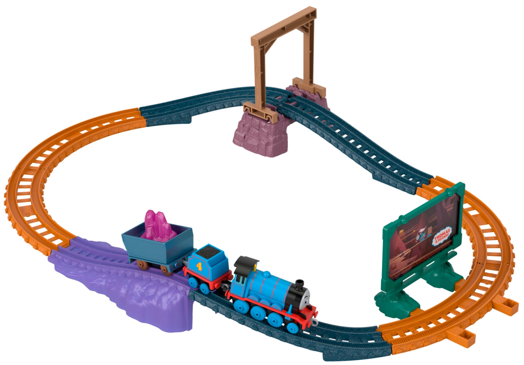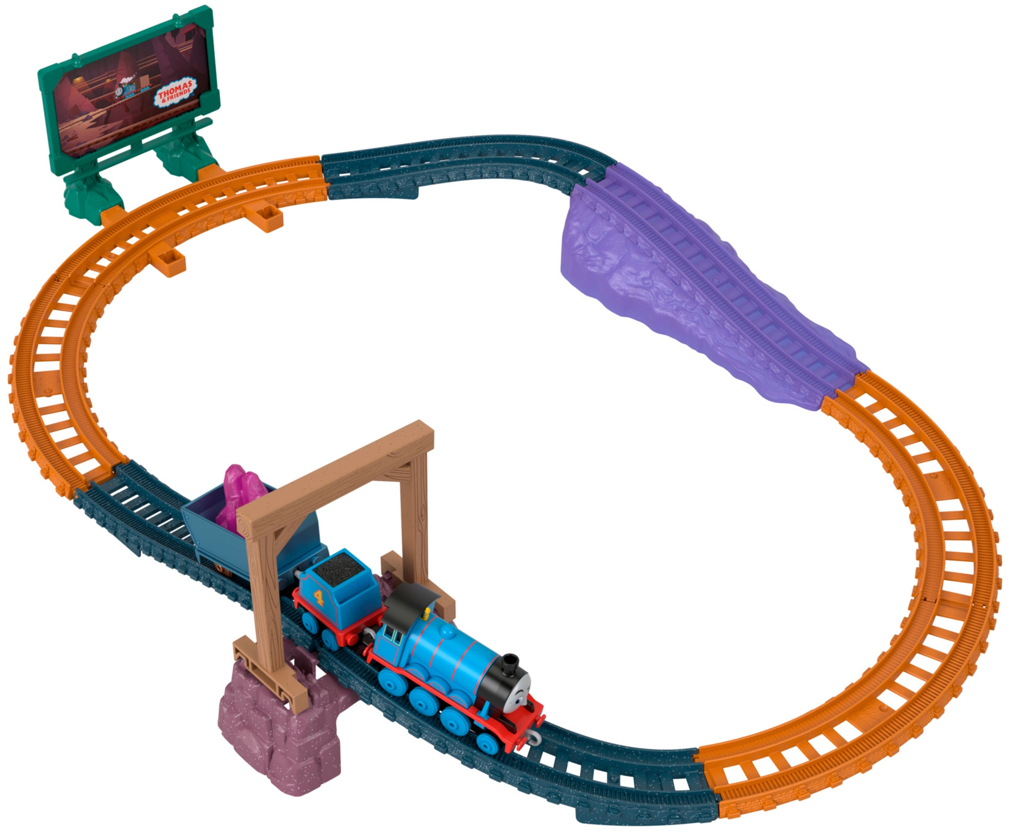 Ovale Schienen mit Brücke, Tunnelrampe und Werbetafel schaffen eine dynamische Umgebung für Spiel und Geschichten aus dem Bergwerk.