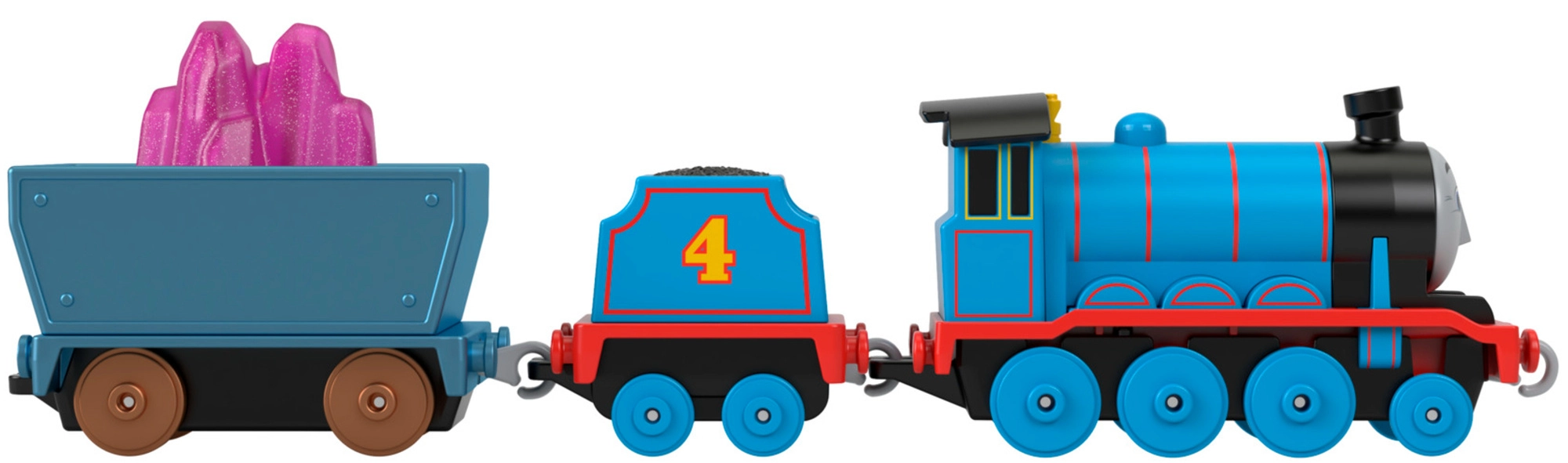 Enthalten sind eine blaue Lokomotive mit Tender, ein offener Wagen und Kristall-Ladung für realistischen Transport von Rohstoffen auf der Strecke.