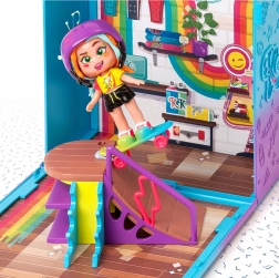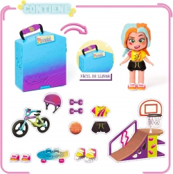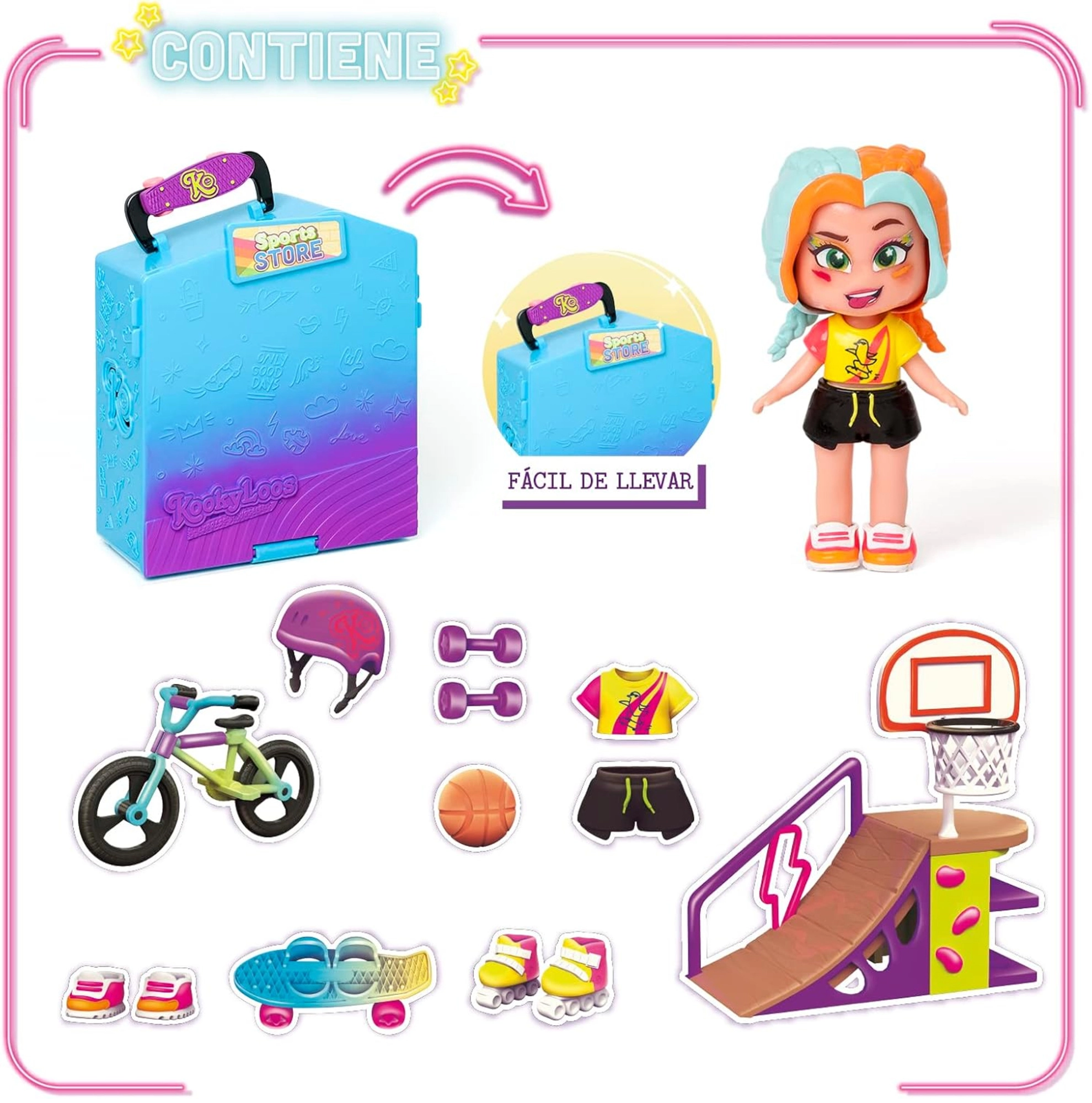 Die KookyLoos Figur von Magic Box bringt Spaß, Stil und eine ausdrucksstarke Persönlichkeit in einem. Die exklusive Lizzie ist bereit für sportliche Abenteuer – mit beweglichen Gelenken, einem Gesichtsausdruck-Wechselmechanismus und tollen Accessoires erschaffen Kinder eigene Geschichten voller Action und Fantasie. Der aufklappbare Koffer verwandelt sich in ein Mini-Sportgeschäft mit Fahrrädern, Rollschuhen und Skateboard.