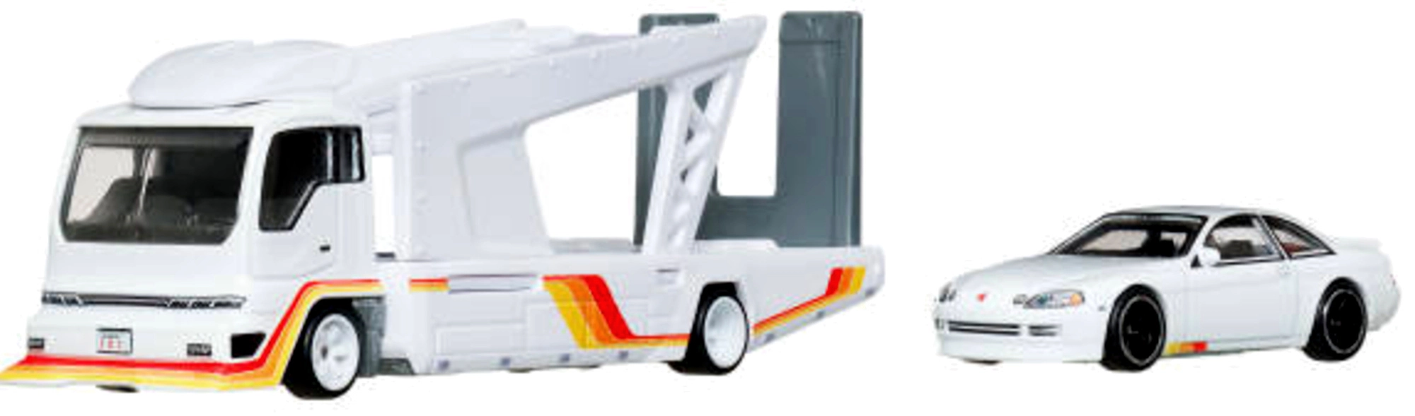 Entdecken Sie das Premium-Set von HOT WHEELS aus der Premium Team Transport Kollektion, das Eleganz und Rennsportgeist vereint. Das Modell Toyota Soarer in Weiß und der stylische Transporter Kousoku Hauler #79 bilden ein perfektes Duo für Ihre Vitrine und kreativen Spielspaß.