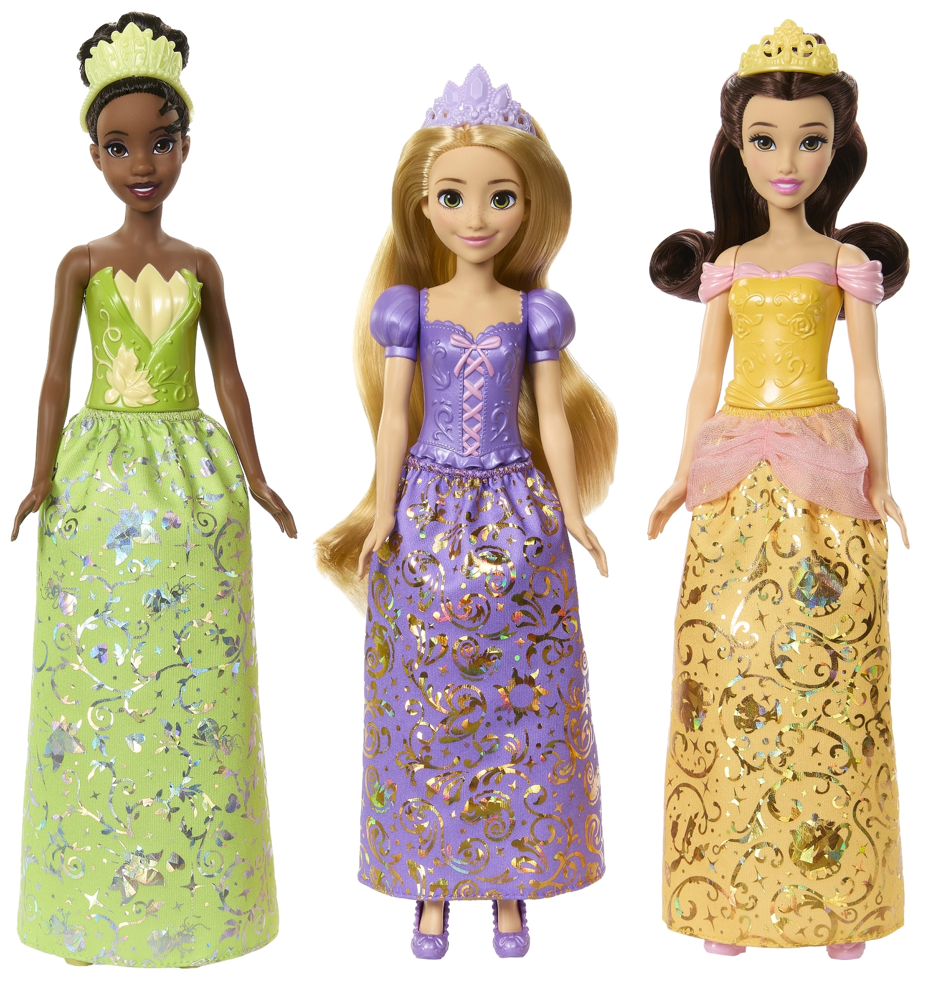Jede Puppe trägt einen abnehmbaren glitzernden Rock oder ein Outfit, eine Krone oder ein Haarband sowie detailreiche Accessoires für stylisches Umkleiden.