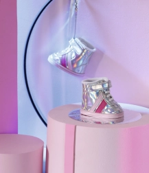 Schnürschuhe mit holografischem Effekt und rosa Details sind ein Trend in der Puppenmode.