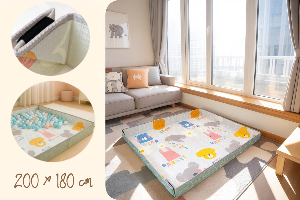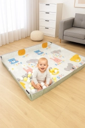 Spezielle Klettverschlüsse ermöglichen es, die Ränder in wenigen Augenblicken aufzurichten und einen weichen Laufstallbereich oder ein Ball Pit zu schaffen – einfach Bälle hinzufügen. Die Matte ist faltbar, leicht und einfach zu reinigen (ein feuchtes Tuch genügt). Im Lieferumfang ist zudem eine praktische Transporttasche mit Reißverschluss für bequemes Verstauen und Mitnehmen enthalten.
