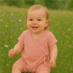 Stilvoller und bequemer Sommer-Overall für Babys – der angenehme Musselin mit feiner Struktur „atmet“ hervorragend und reduziert das Risiko von Überhitzung. Der Wickelschnitt mit Bändchen an der Seite und innenliegendem Druckknopf hält die Form, während die Druckknöpfe im Schritt das Wickeln beschleunigen.