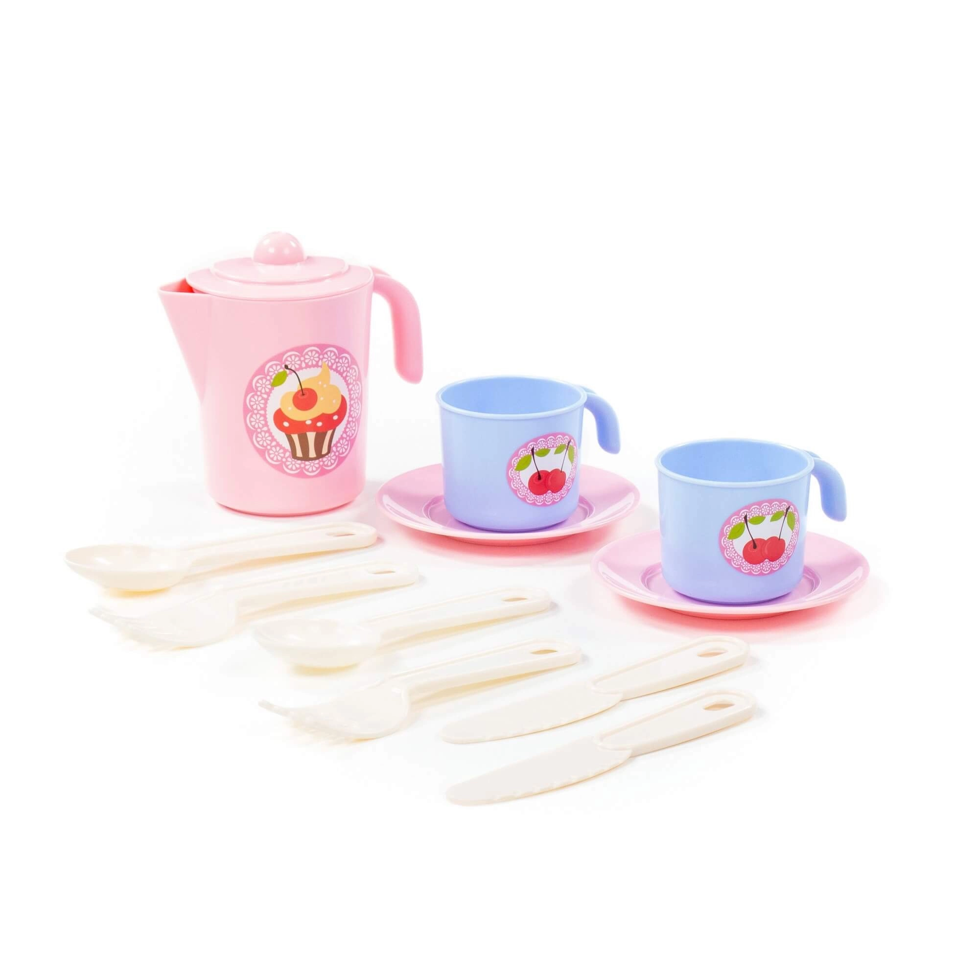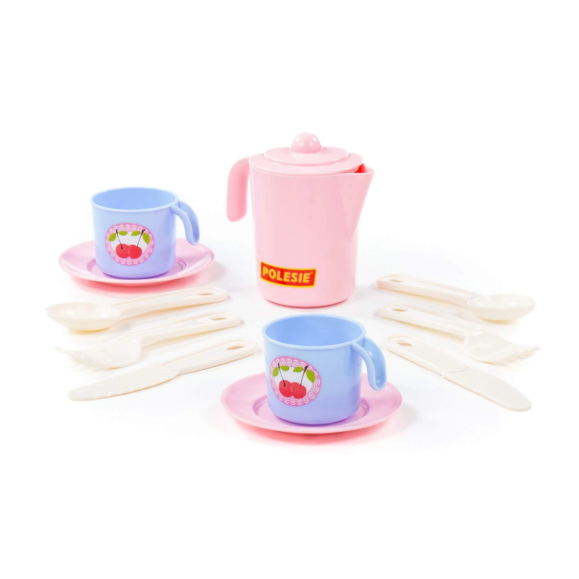 Zwölfteilige Ausstattung für realistische Teestunden: Kanne mit Deckel, 2 Tassen, 2 Teller und ein Besteck-Set.