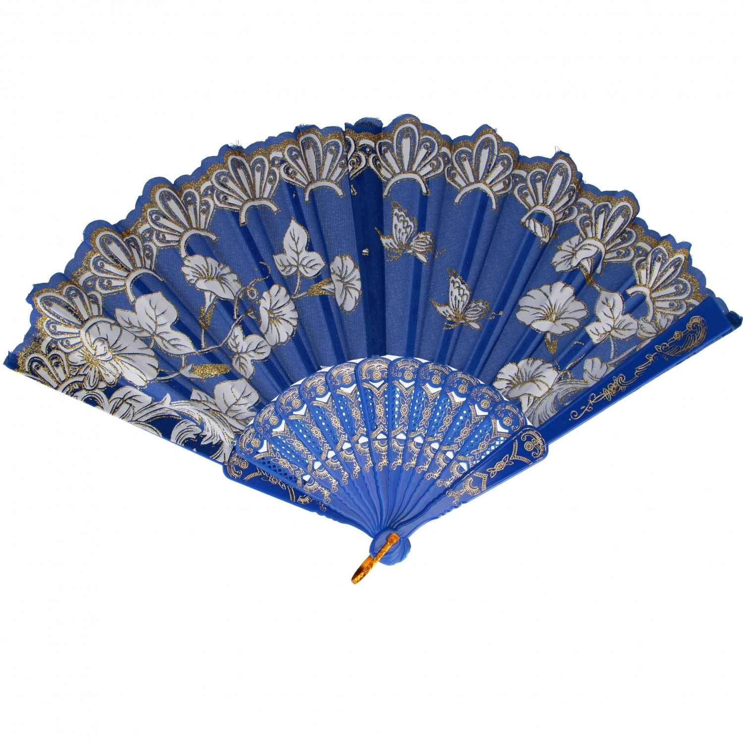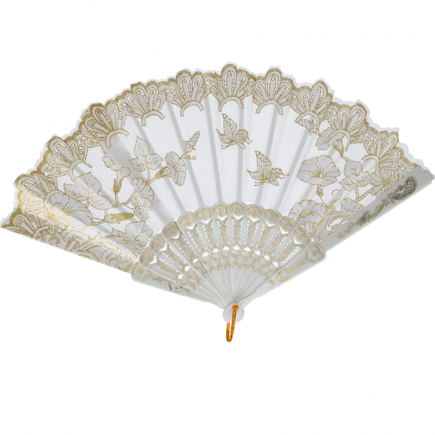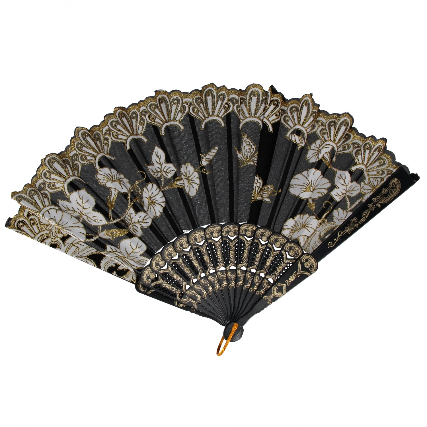 Dieser dekorative, faltbare Handfächer vereint Praktikabilität und Ästhetik. Dank der kompakten Größe von 23 cm passt er in Handtasche und Rucksack und sorgt sofort für eine angenehme Brise. Stoffpaneele mit feinem Blumenmuster und goldenen Akzenten wirken stilvoll und elegant.