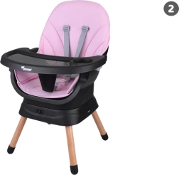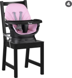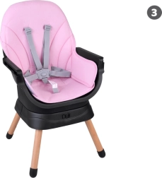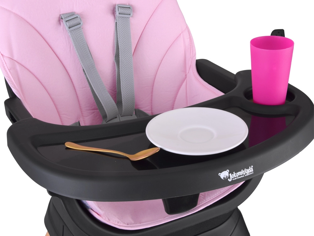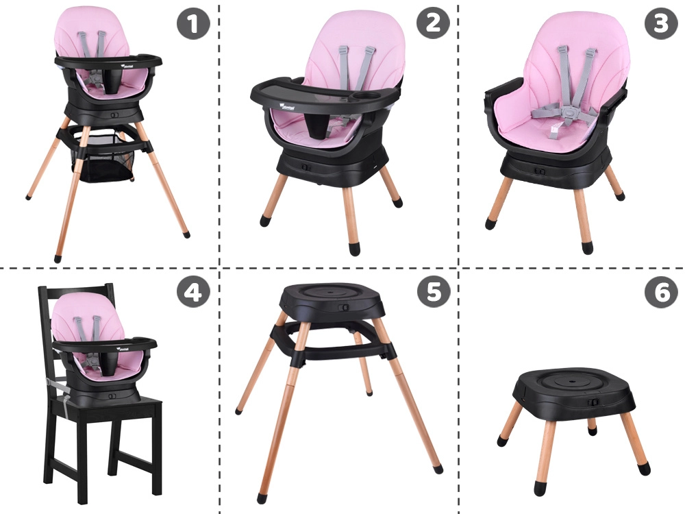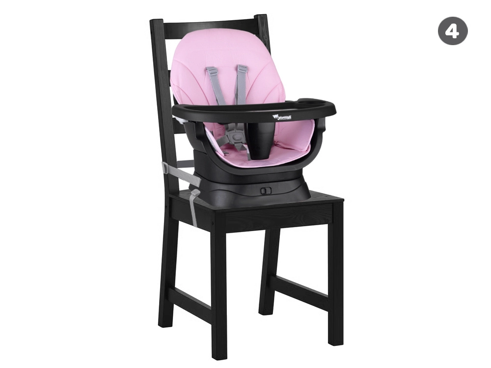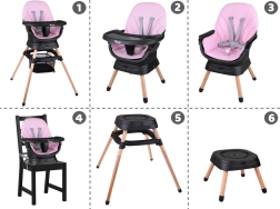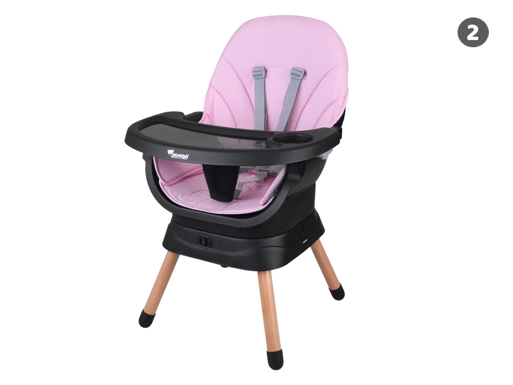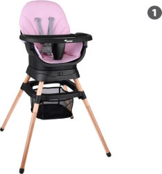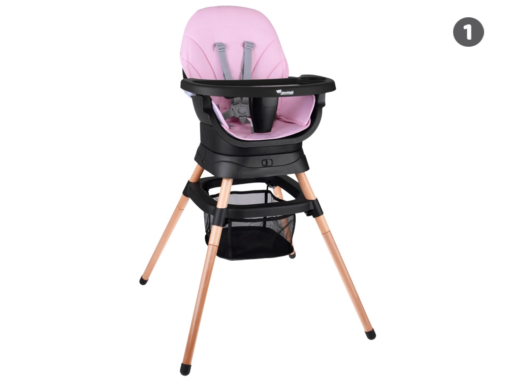 Das modulare System ermöglicht einen schnellen Umbau ohne Werkzeug: hoher Hochstuhl, niedriger Stuhl mit Tablett, separater Sessel, Aufsatz für den Essstuhl mit Gurten, hoher Hocker und niedriger Schemel. Der Bereich unter dem Stuhl wird durch einen praktischen Korb für Kleinigkeiten ergänzt.